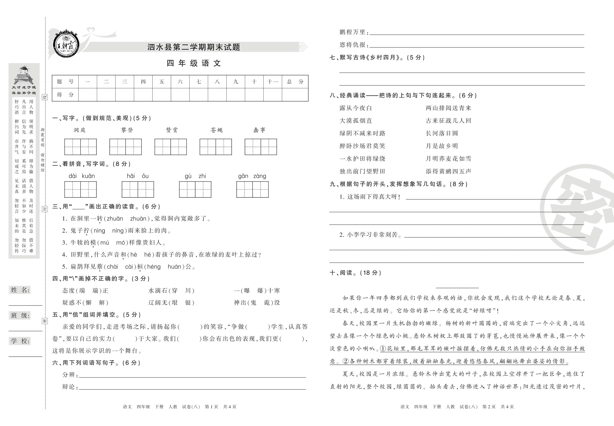 2015-2016学年第二学期济宁市泗水县四年级语文试卷(人教版)【8】