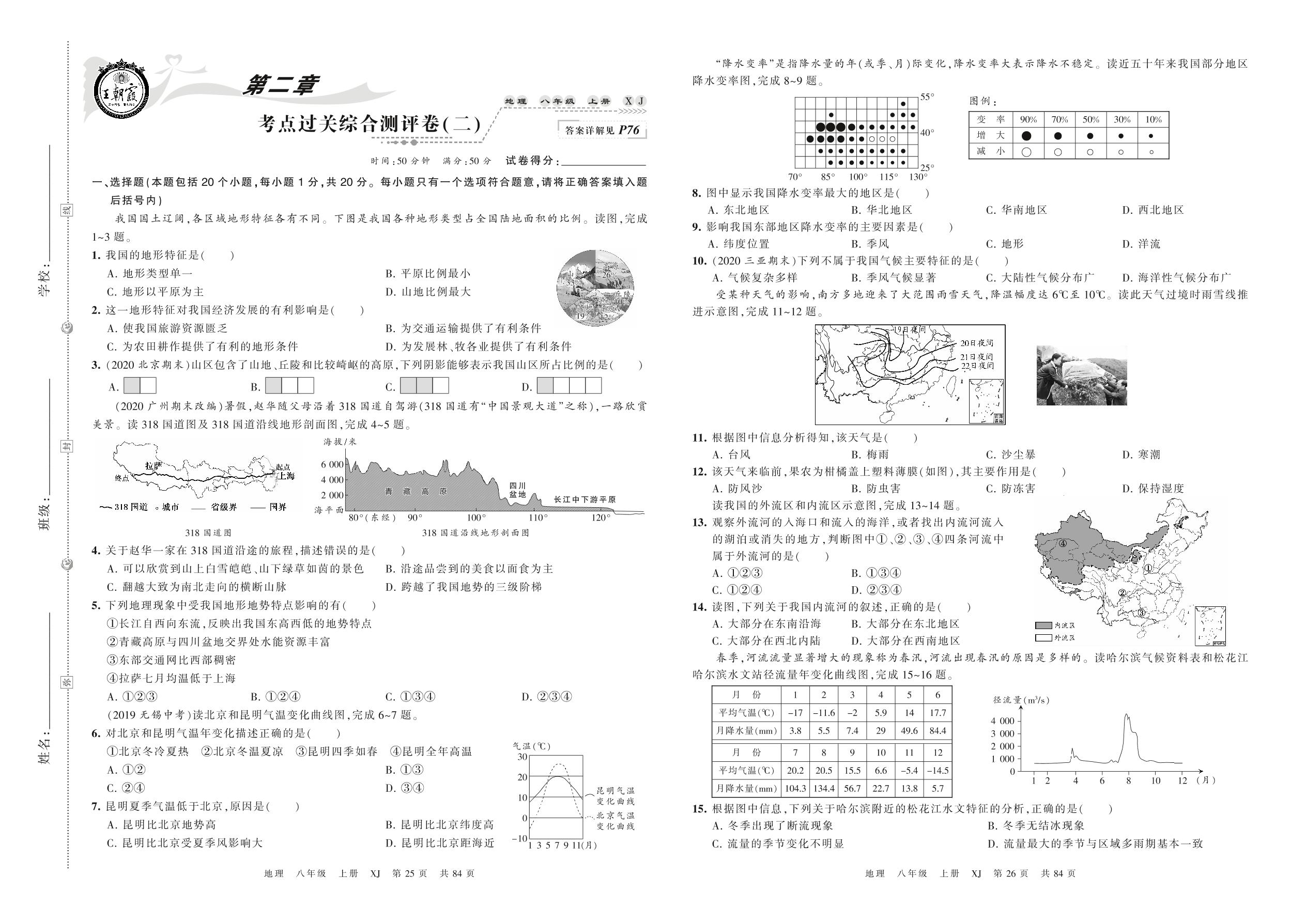 2021上册八年级地理湘教版 第二章 考点过关综合测评卷(二)
