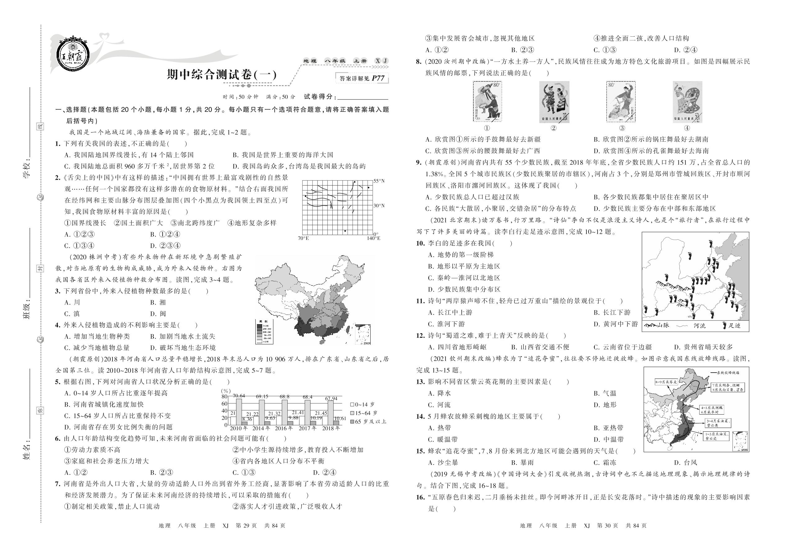2021上册八年级地理湘教版 期中综合测试卷(一)