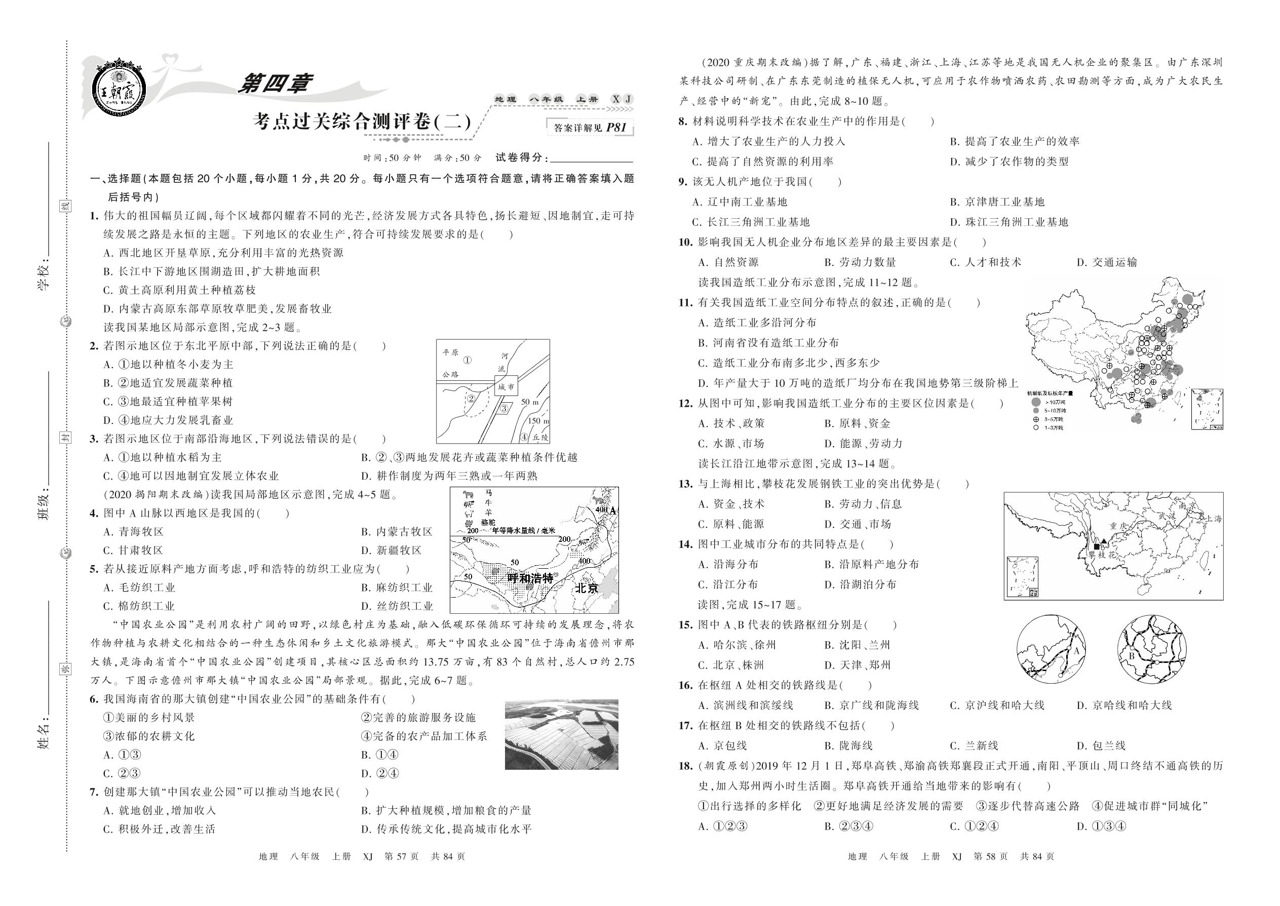 2021上册八年级地理湘教版 第四章 考点过关综合测评卷(二)
