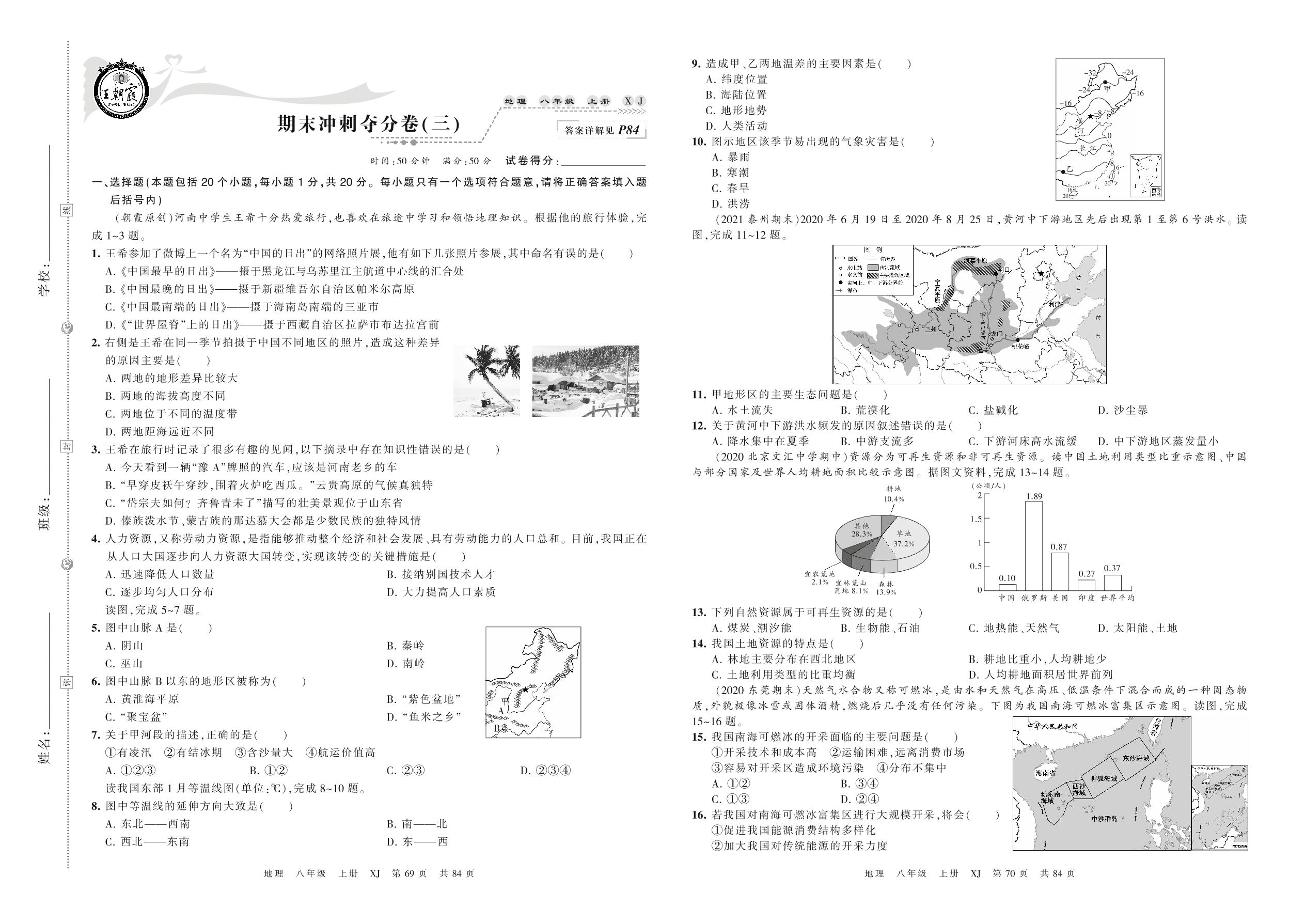 2021上册八年级地理湘教版 期末冲刺夺分卷(三)
