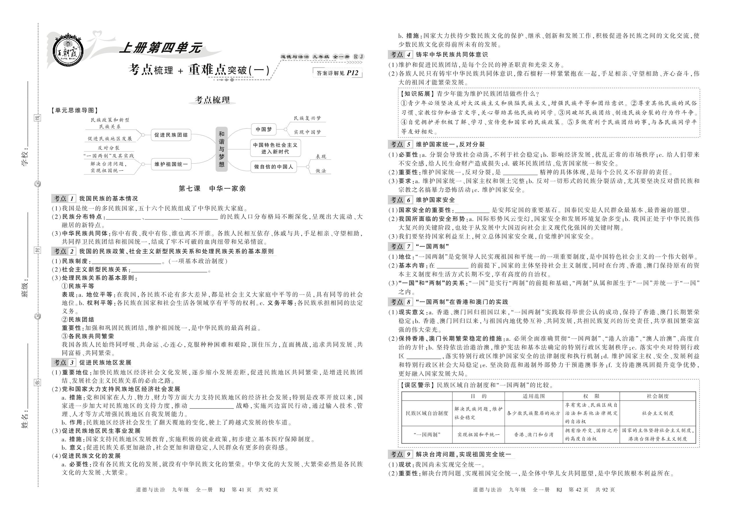 2021秋上册九年级道德与法治人教版 第四单元 考点梳理 + 重难点突破(一)
