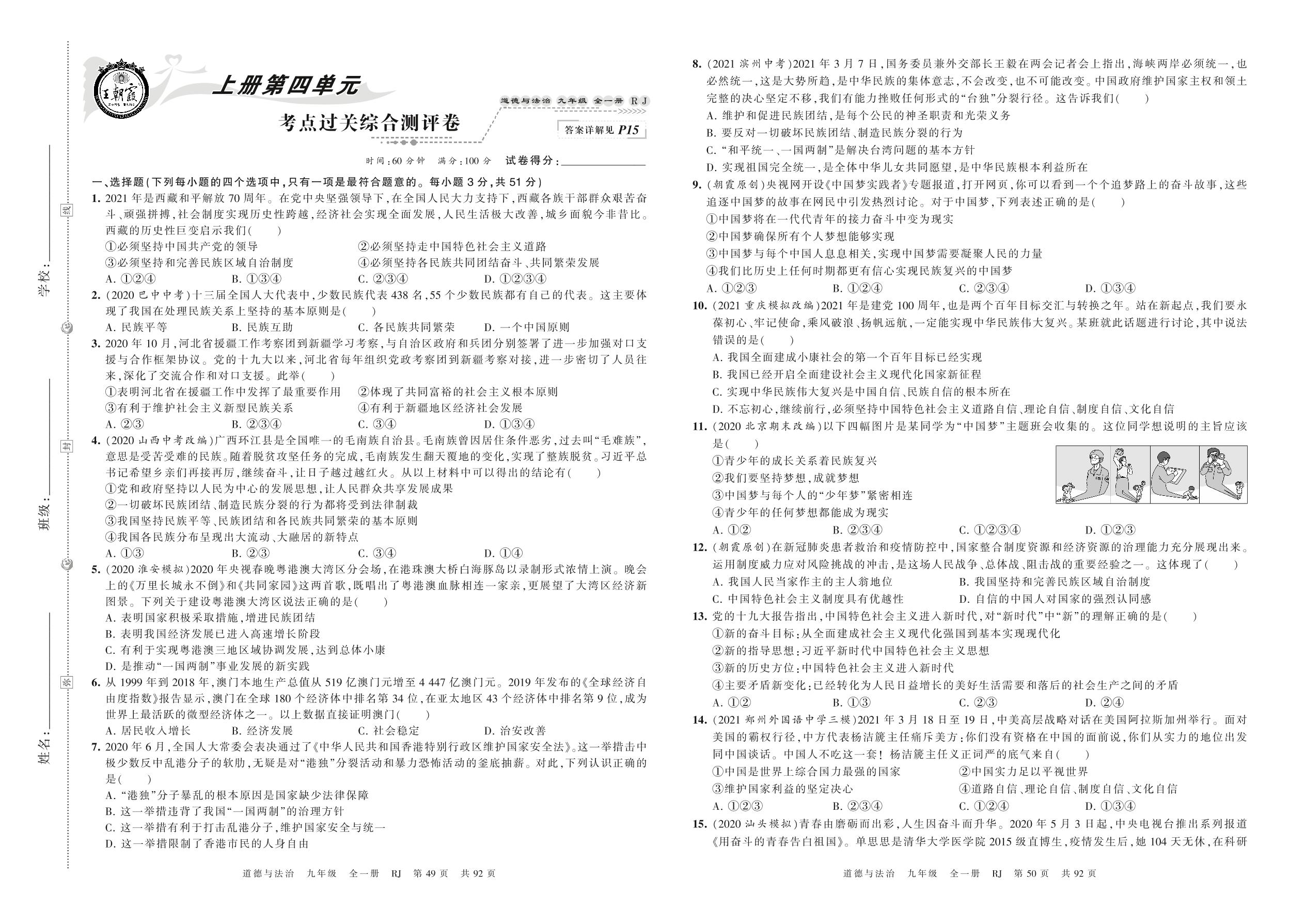 2021秋上册九年级道德与法治人教版 第四单元 考点过关综合测评卷