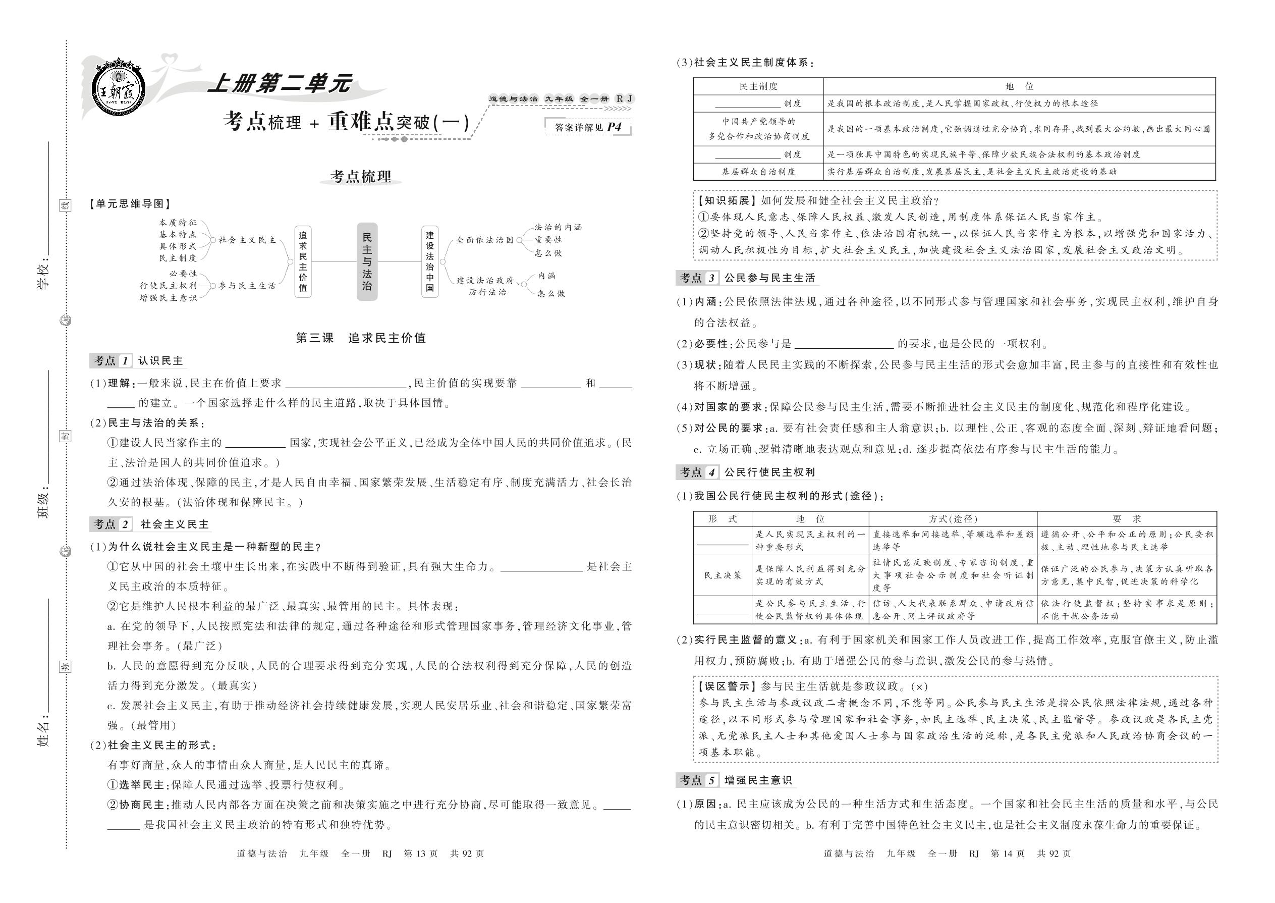 2021秋上册九年级道德与法治人教版 第二单元 考点梳理 + 重难点突破(一)