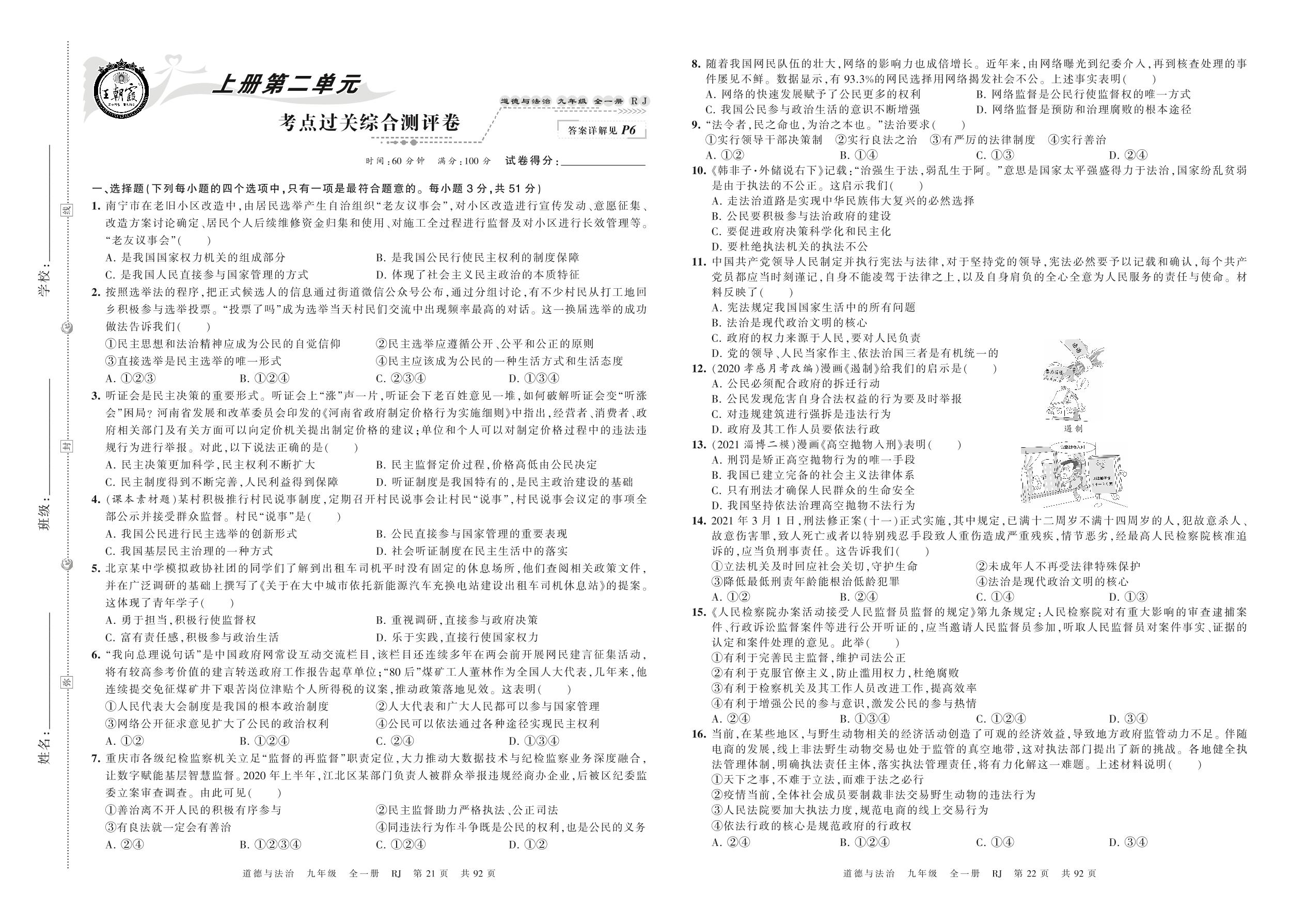 2021秋上册九年级道德与法治人教版 第二单元 考点过关综合测评卷