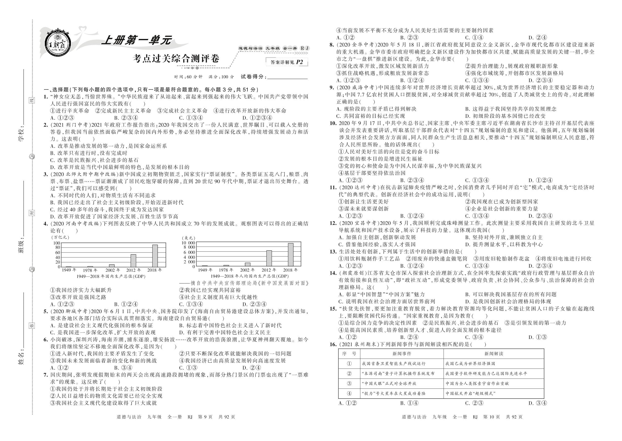 九年级道德与法治人教版上册单元卷