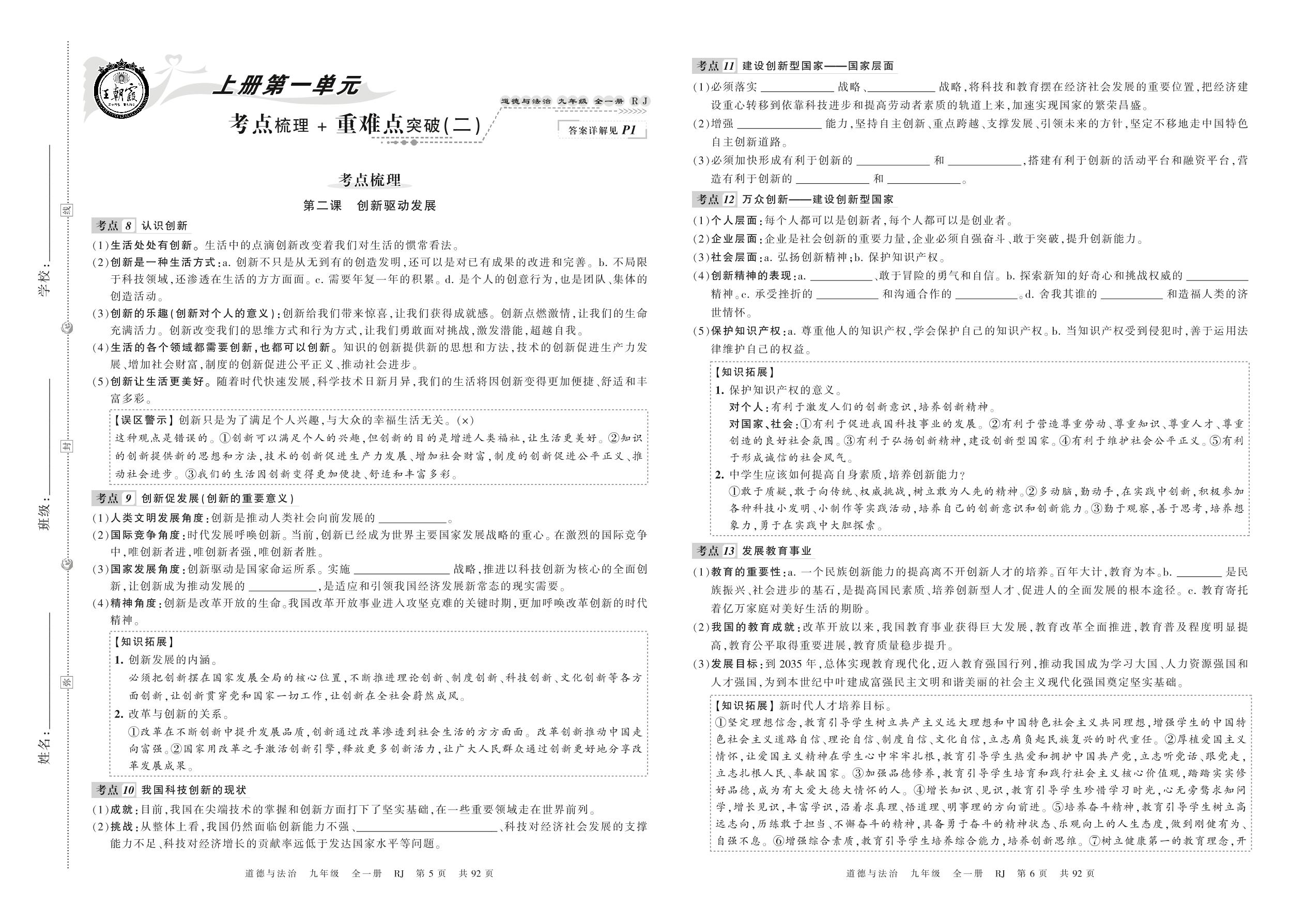 2021秋上册九年级道德与法治人教版 第一单元 考点梳理 + 重难点突破(二)