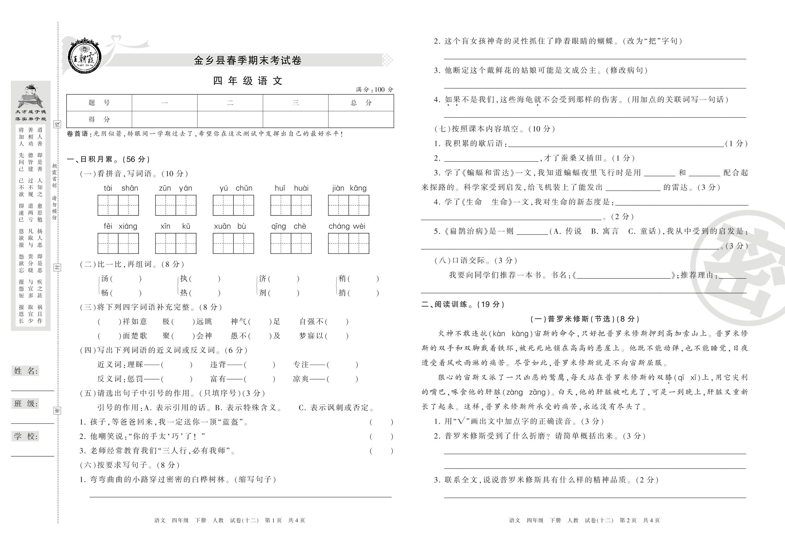 2015-2016学年第二学期济宁市金乡县四年级语文试卷(人教版)【12】