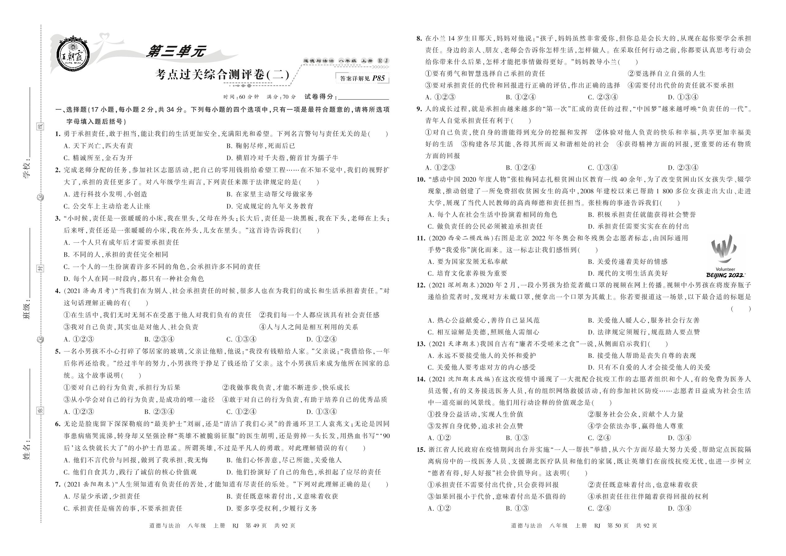 2021上册八年级道德与法治人教版 第三单元 考点过关综合测评卷(二)