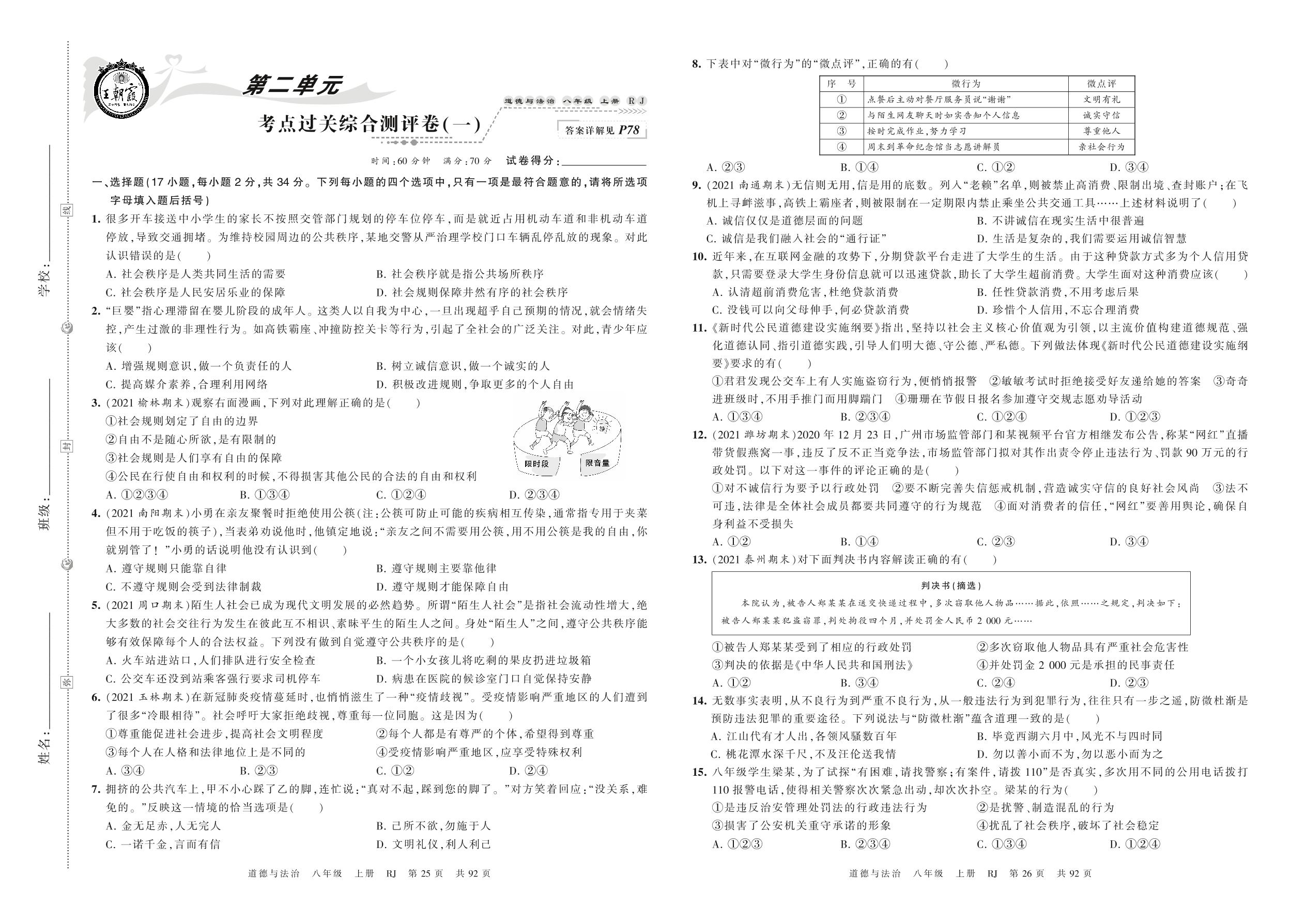 2021上册八年级道德与法治人教版 第二单元 考点过关综合测评卷(一)