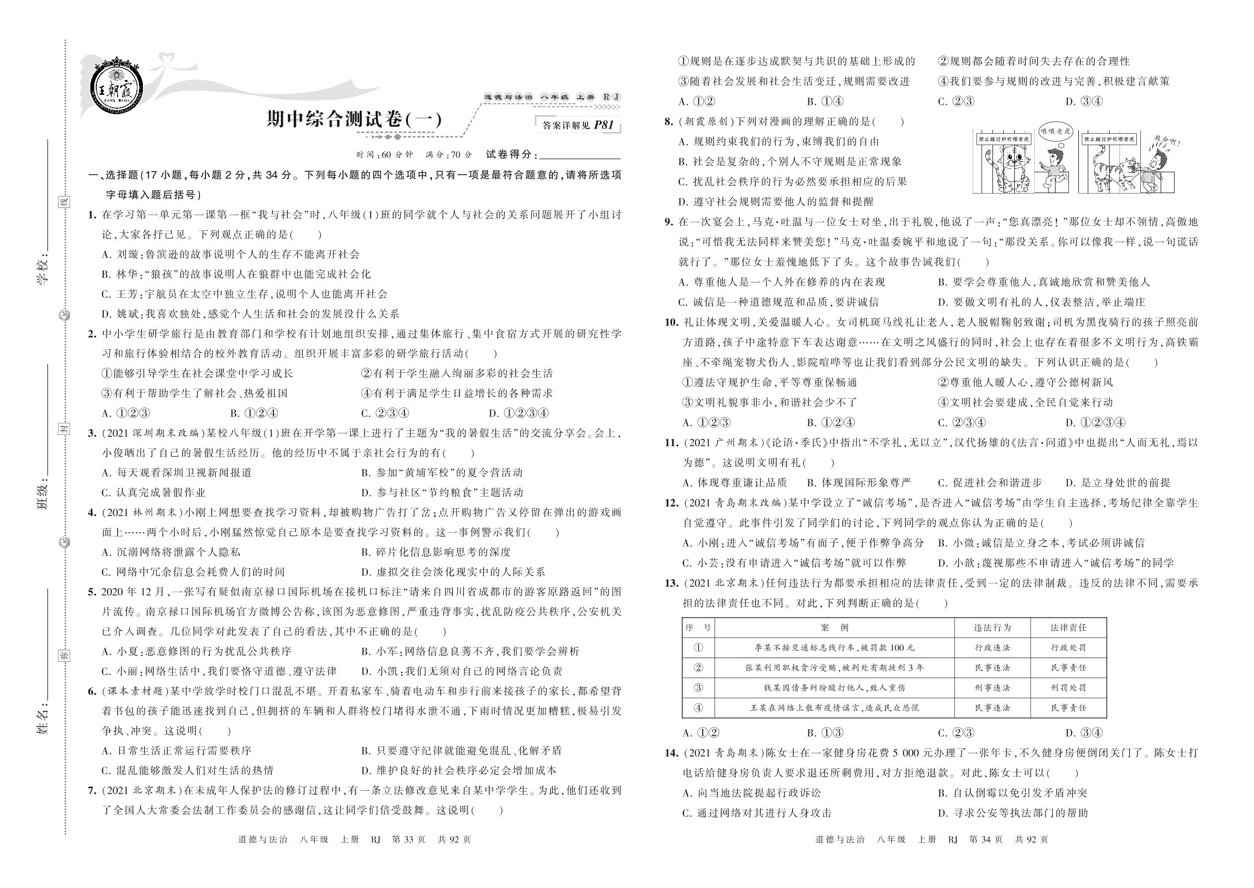 2021上册八年级道德与法治人教版 期中综合测试卷(一)