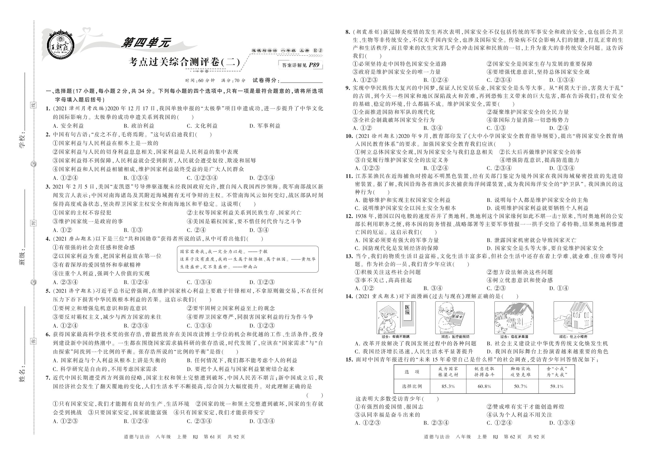 2021上册八年级道德与法治人教版 第四单元 考点过关综合测评卷(二)