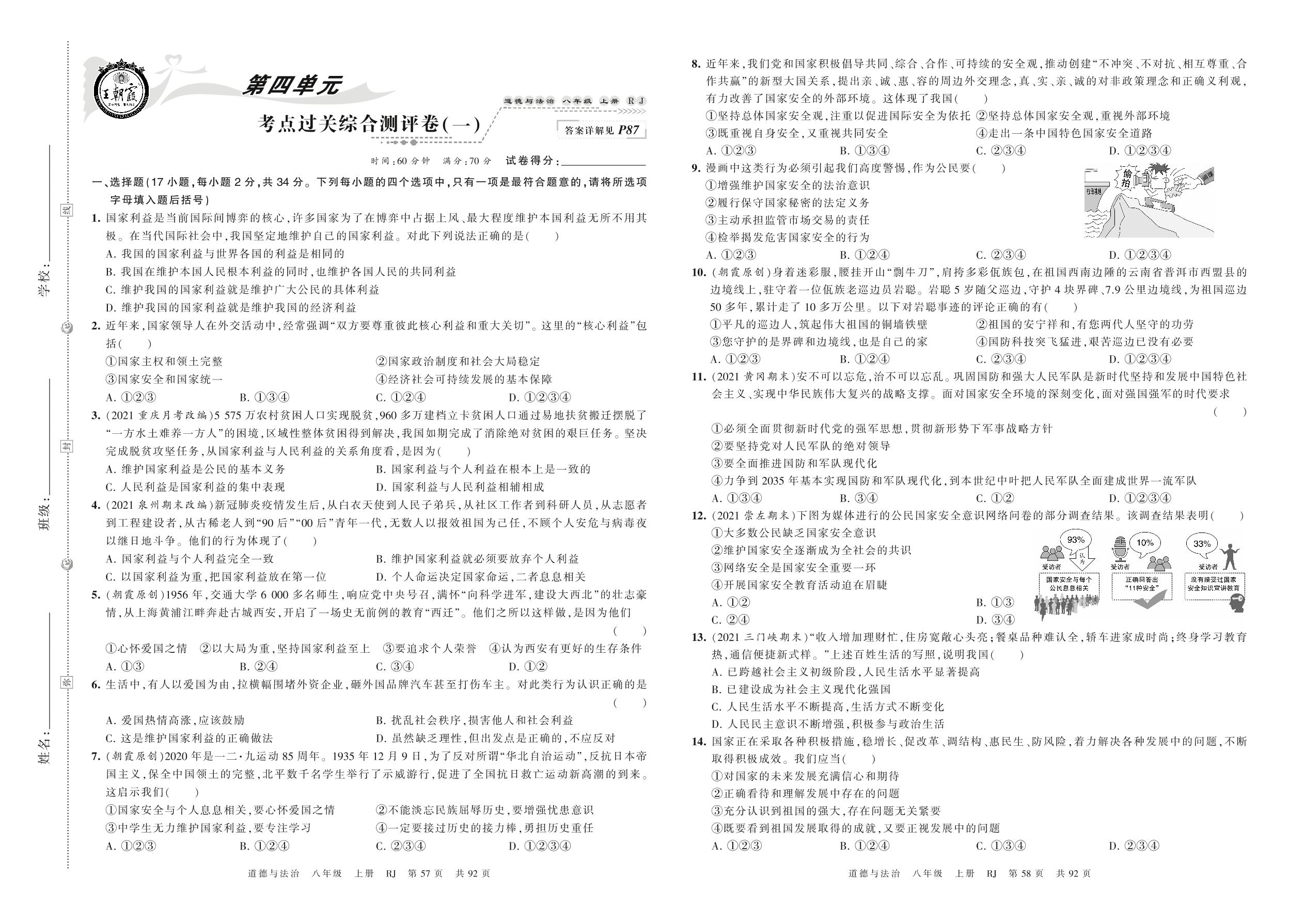 2021上册八年级道德与法治人教版 第四单元 考点过关综合测评卷(一)