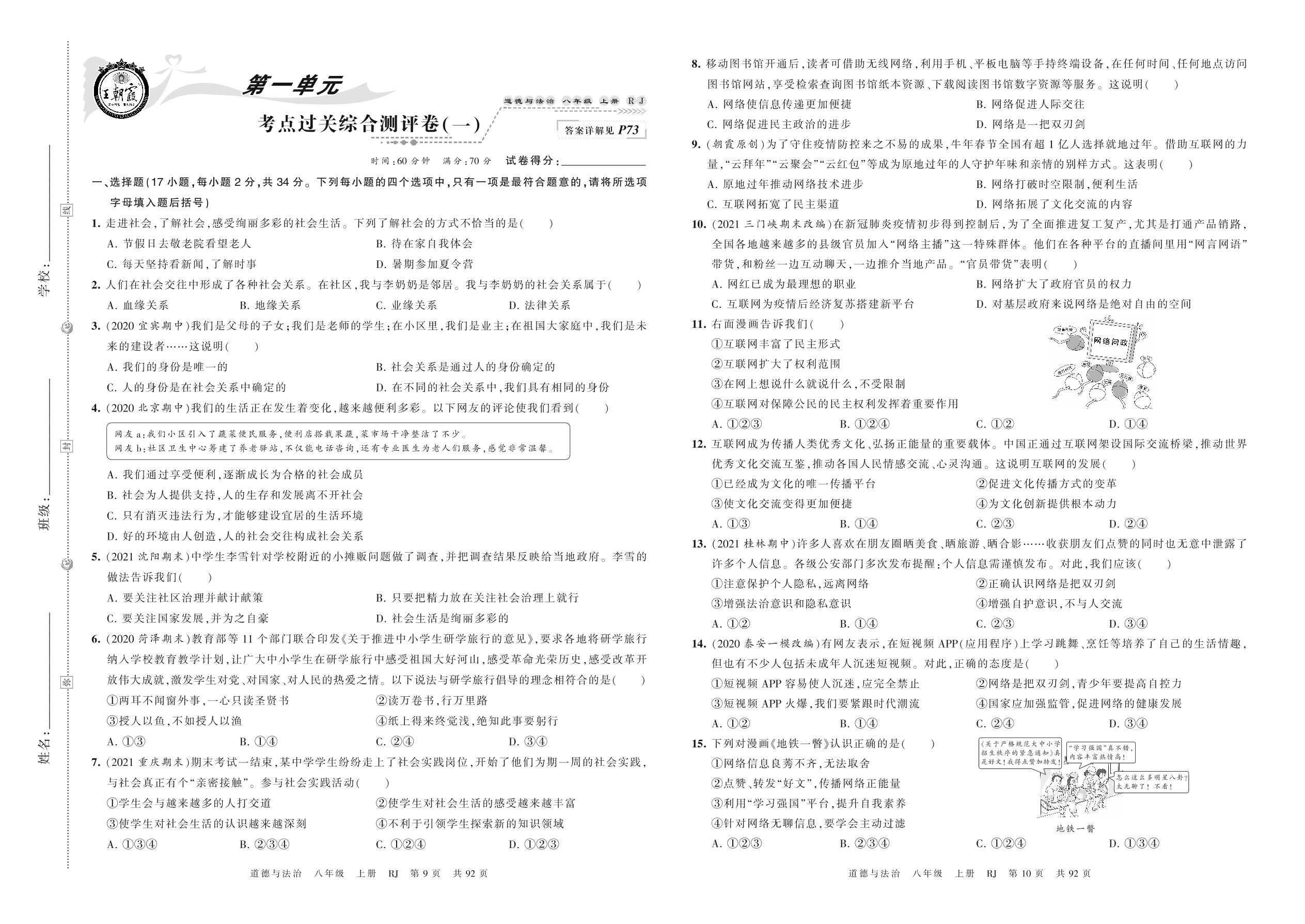 2021上册八年级道德与法治人教版 第一单元 考点过关综合测评卷(一)