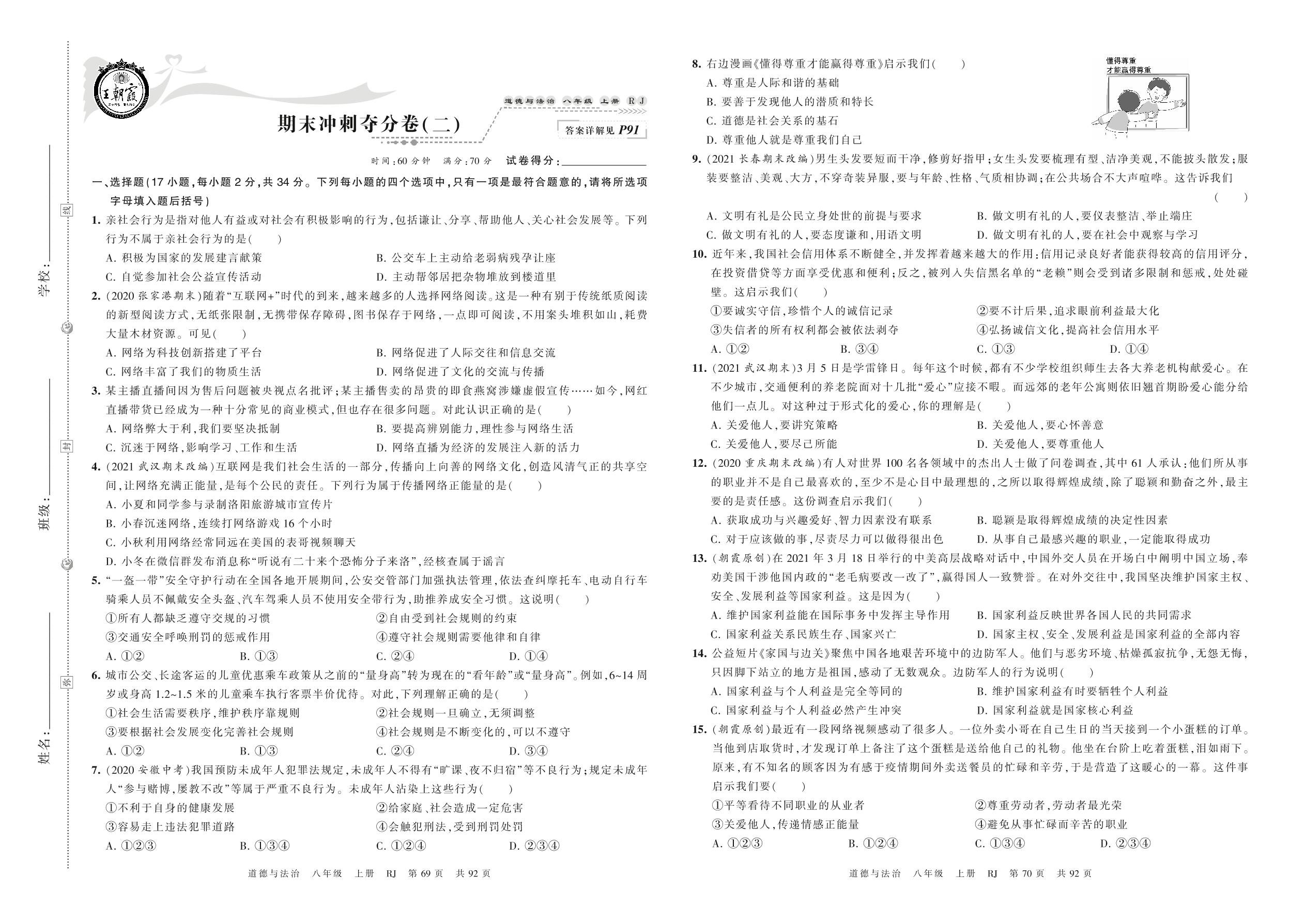 2021上册八年级道德与法治人教版 期末冲刺夺分卷(二)