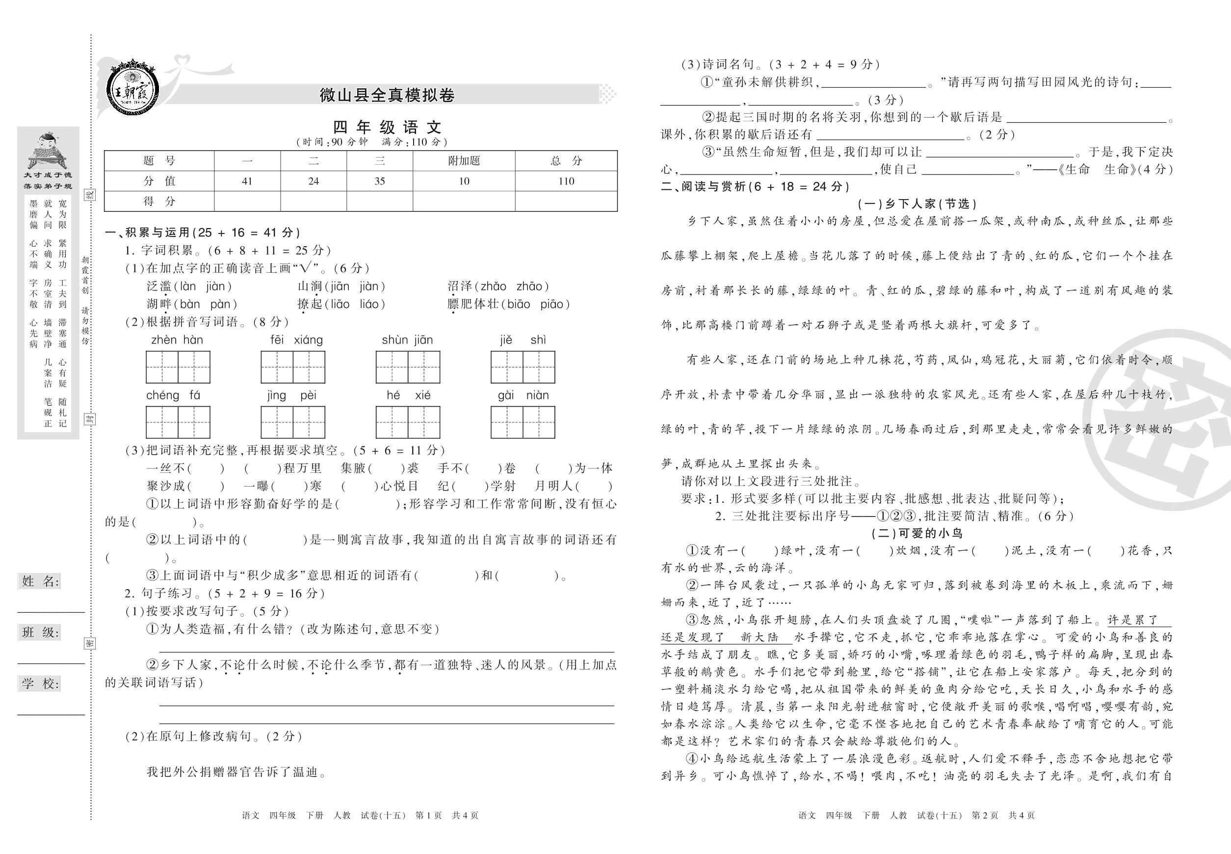 2015-2016学年第二学期济宁市微山县全真模拟卷四年级语文试卷(人教版)【15】