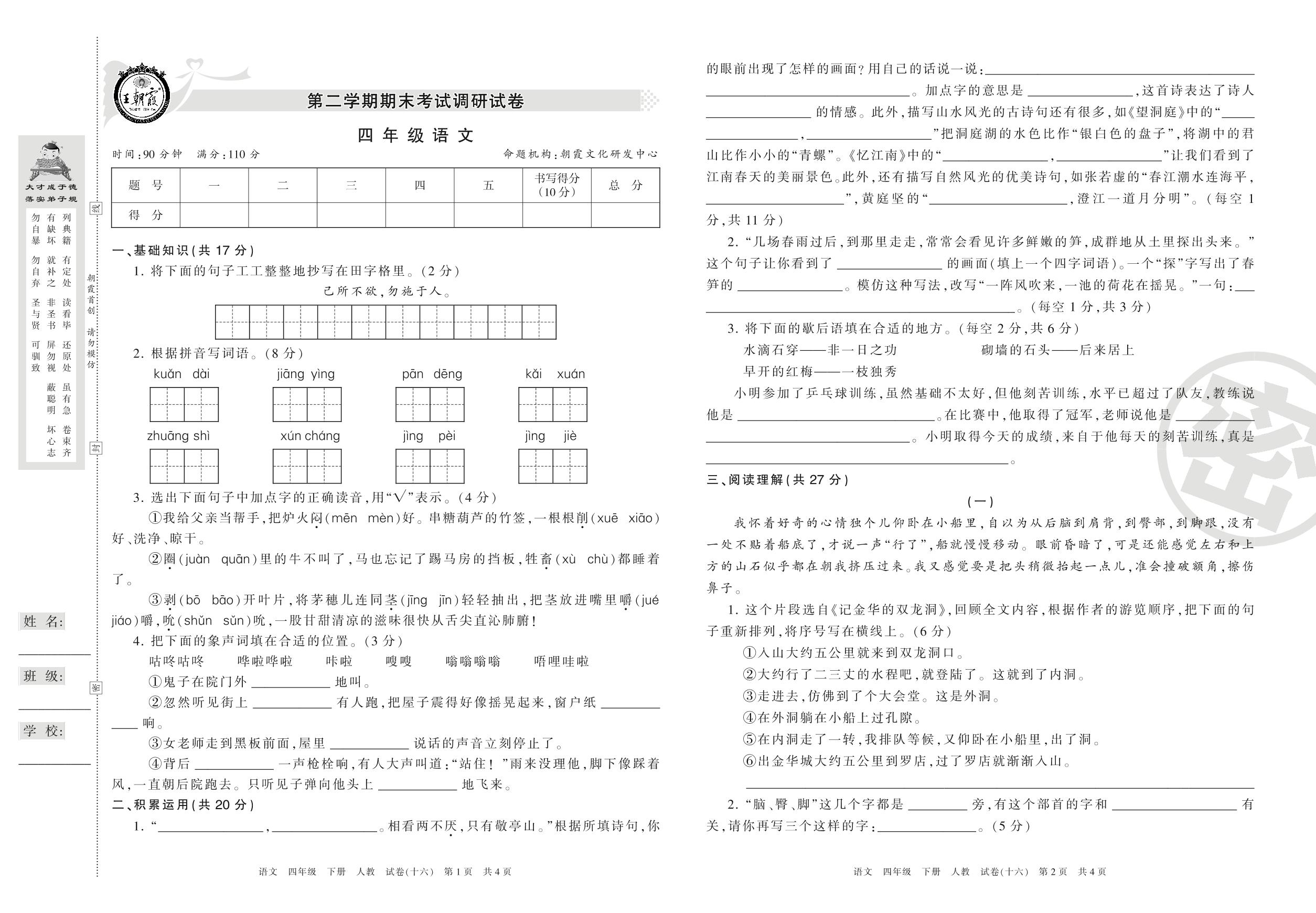 王朝霞期末调研卷四年级下册语文(人教版)【16】