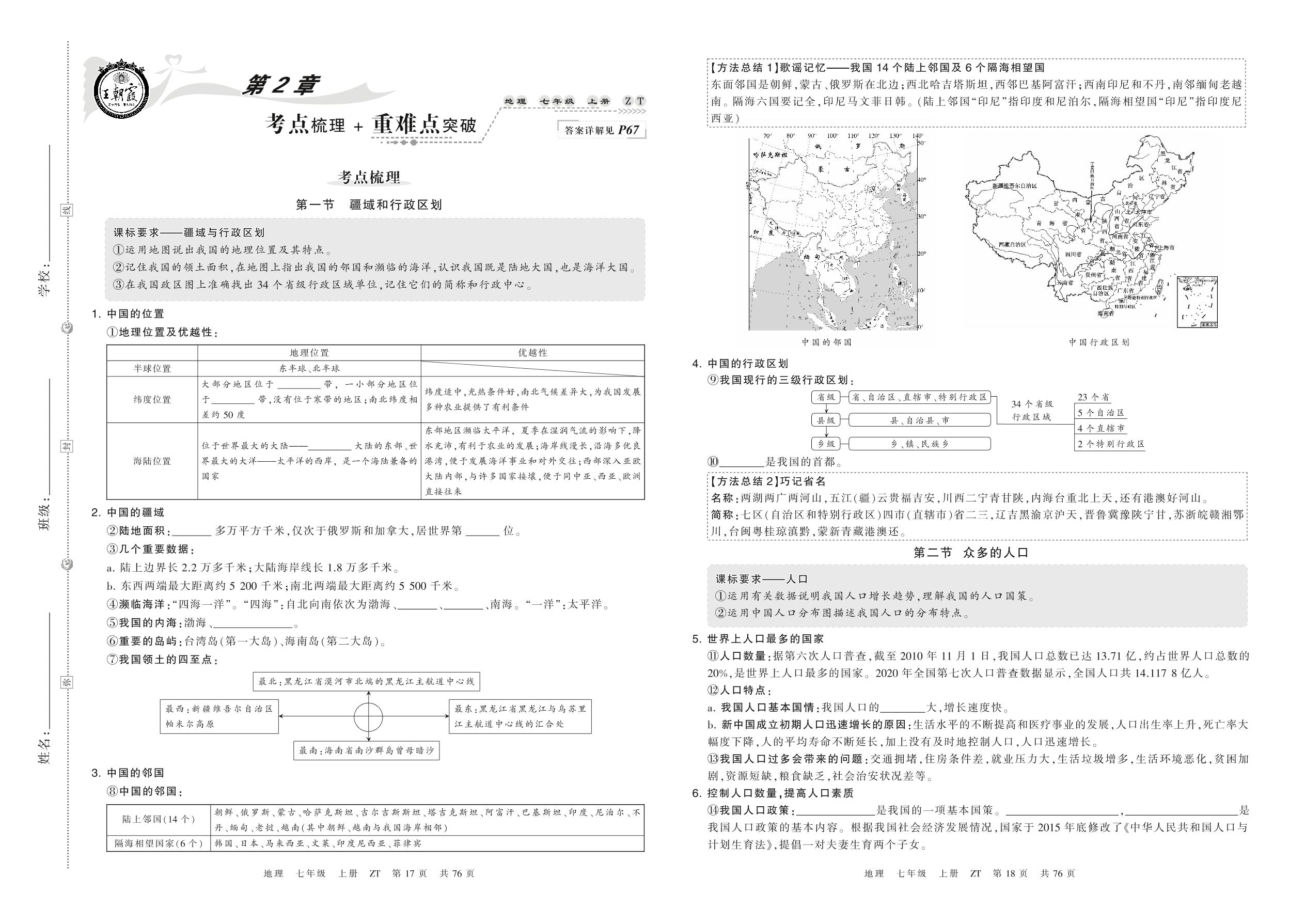 2021上册七年级地理中图版 第2章 考点梳理+重难点突破