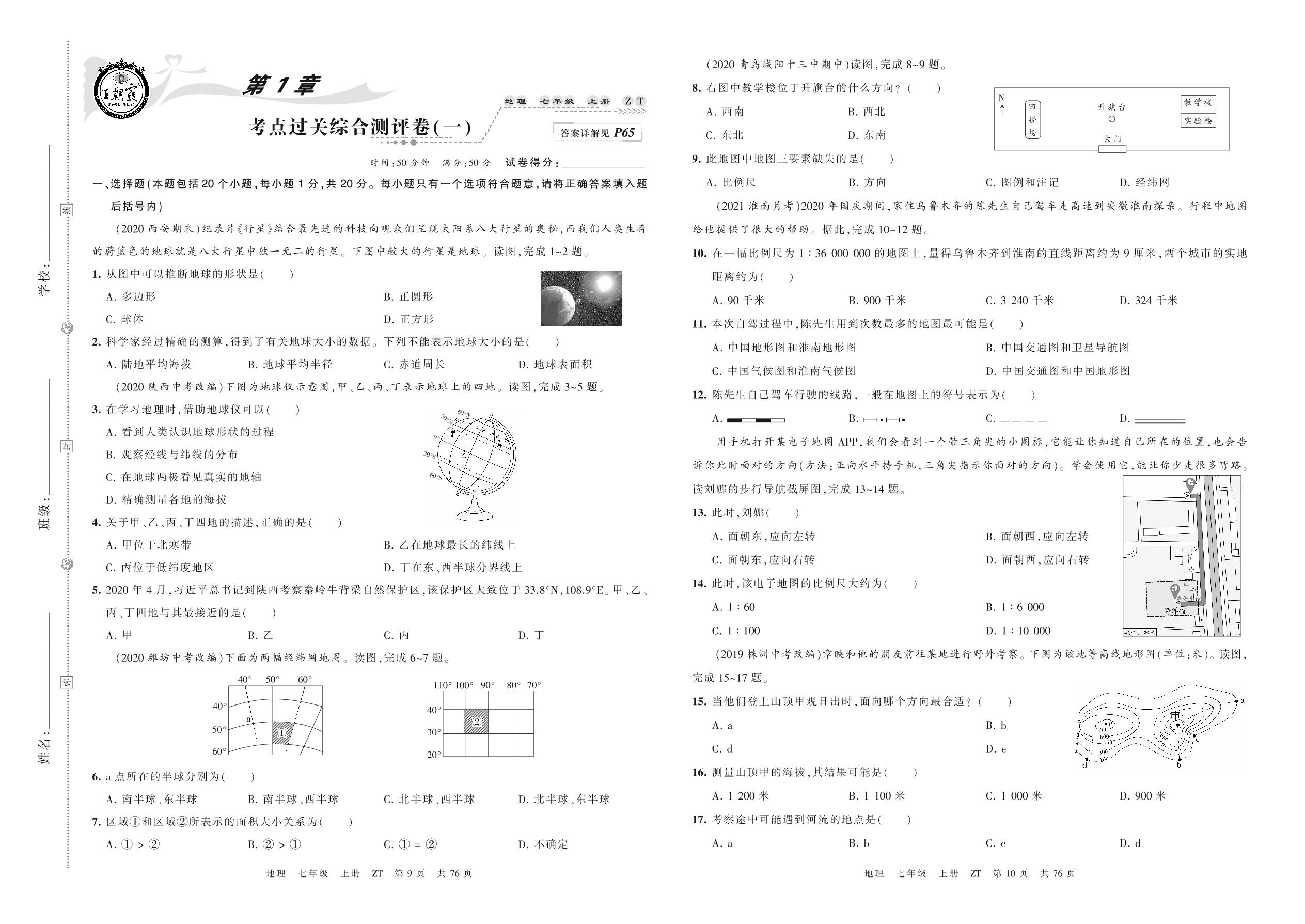 2021上册七年级地理中图版 第1章 考点过关综合测评卷(一)