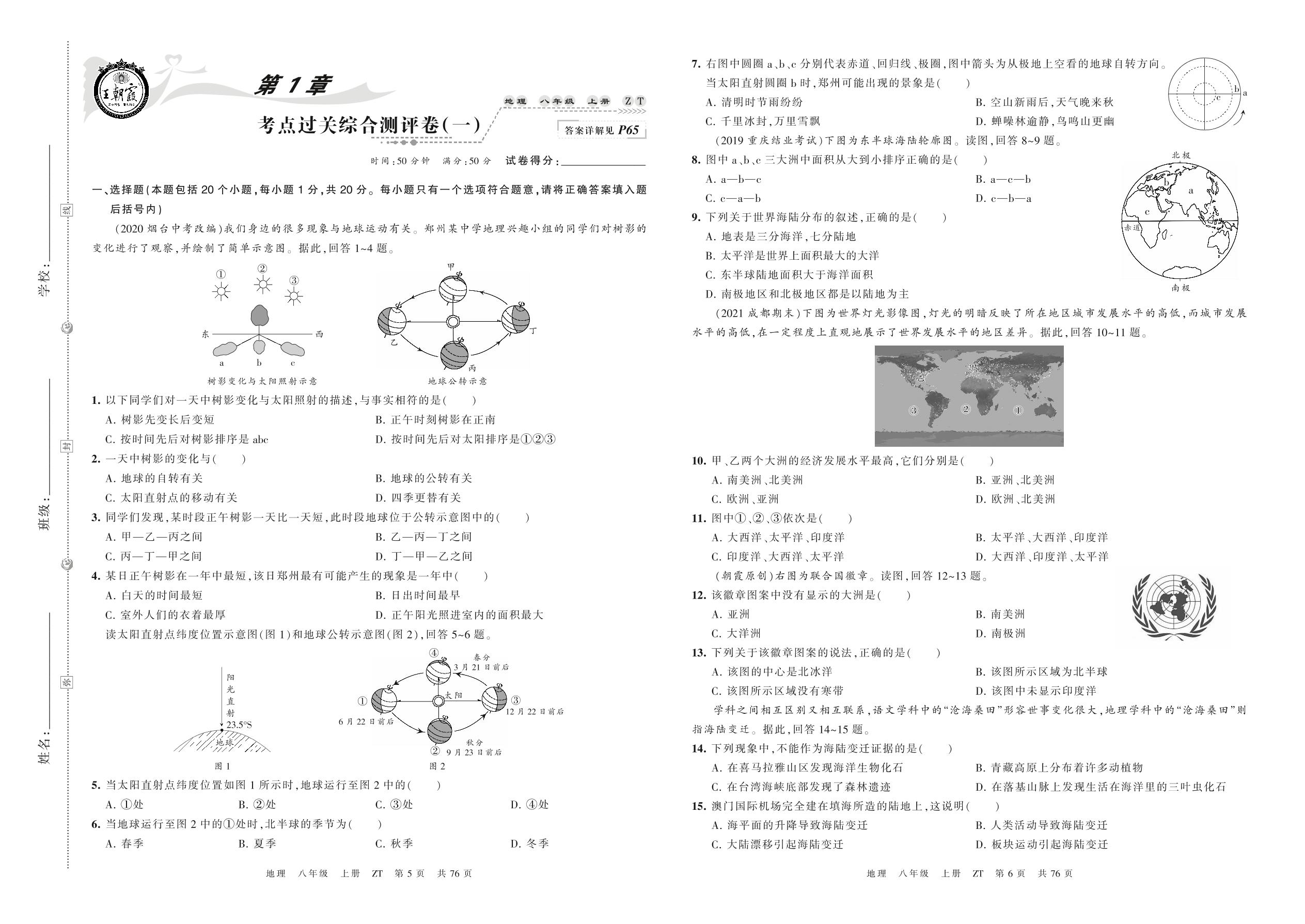 2021上册八年级地理中图版 第1章 考点过关综合测评卷(一)
