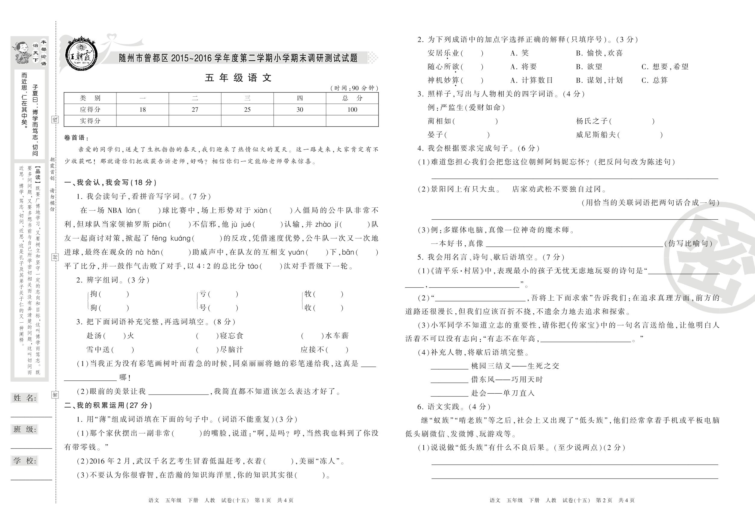 2015-2016学年第二学期随州市曾都区五年级语文试卷(人教版)【15】