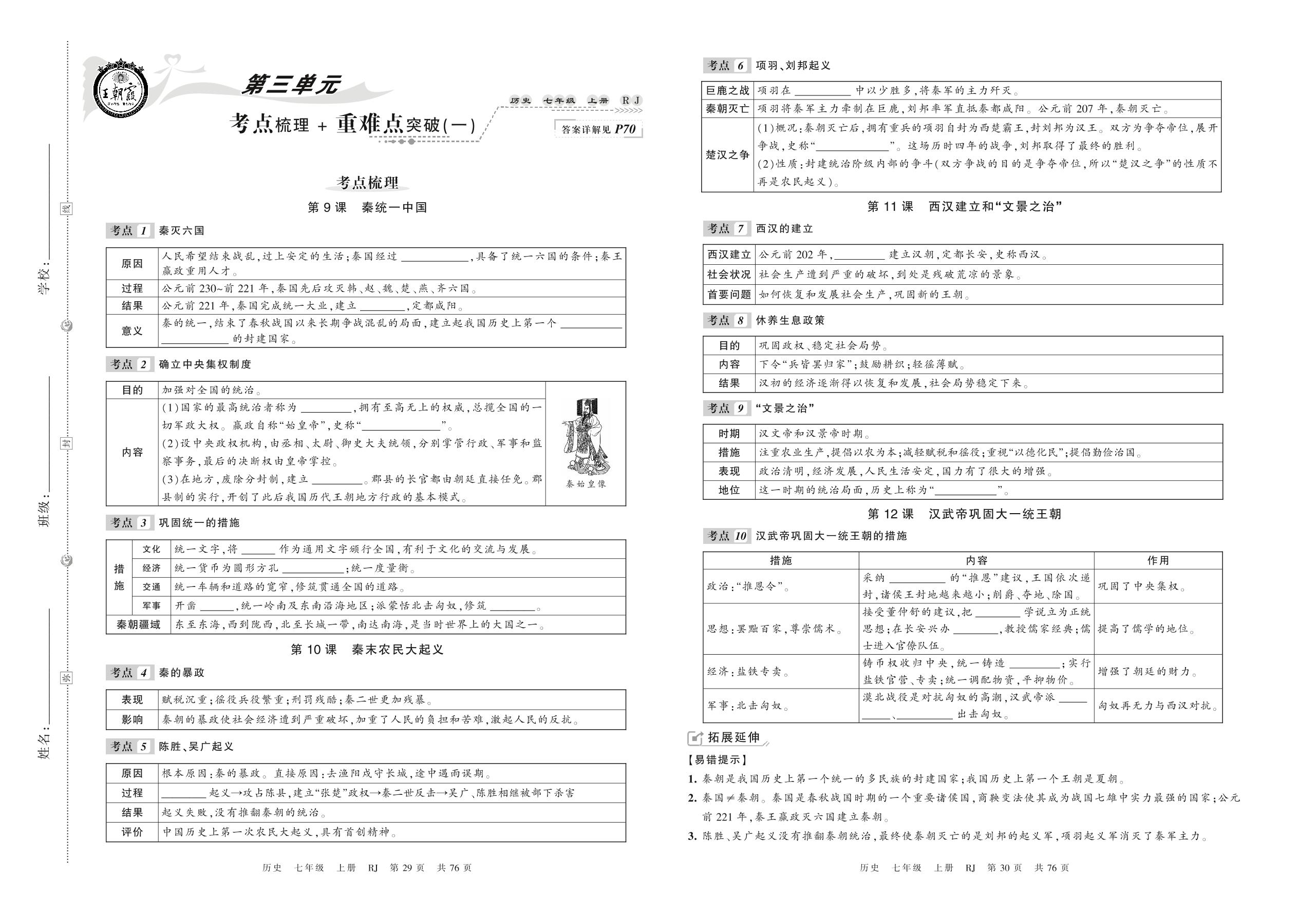 2021上册七年级历史人教版 第三单元 考点梳理+重难点突破(一)