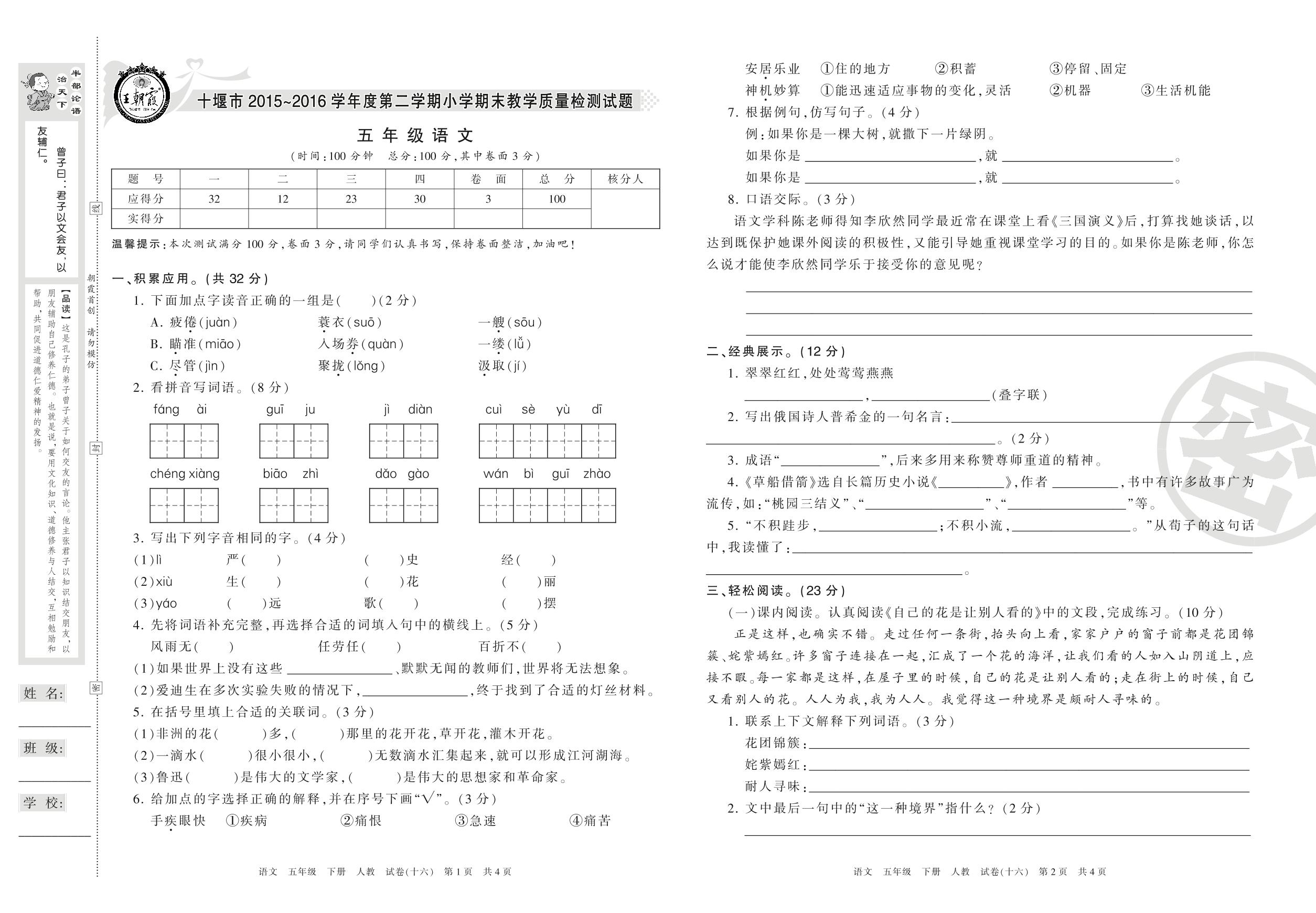 2015-2016学年第二学期十堰市五年级语文试卷(人教版)【16】