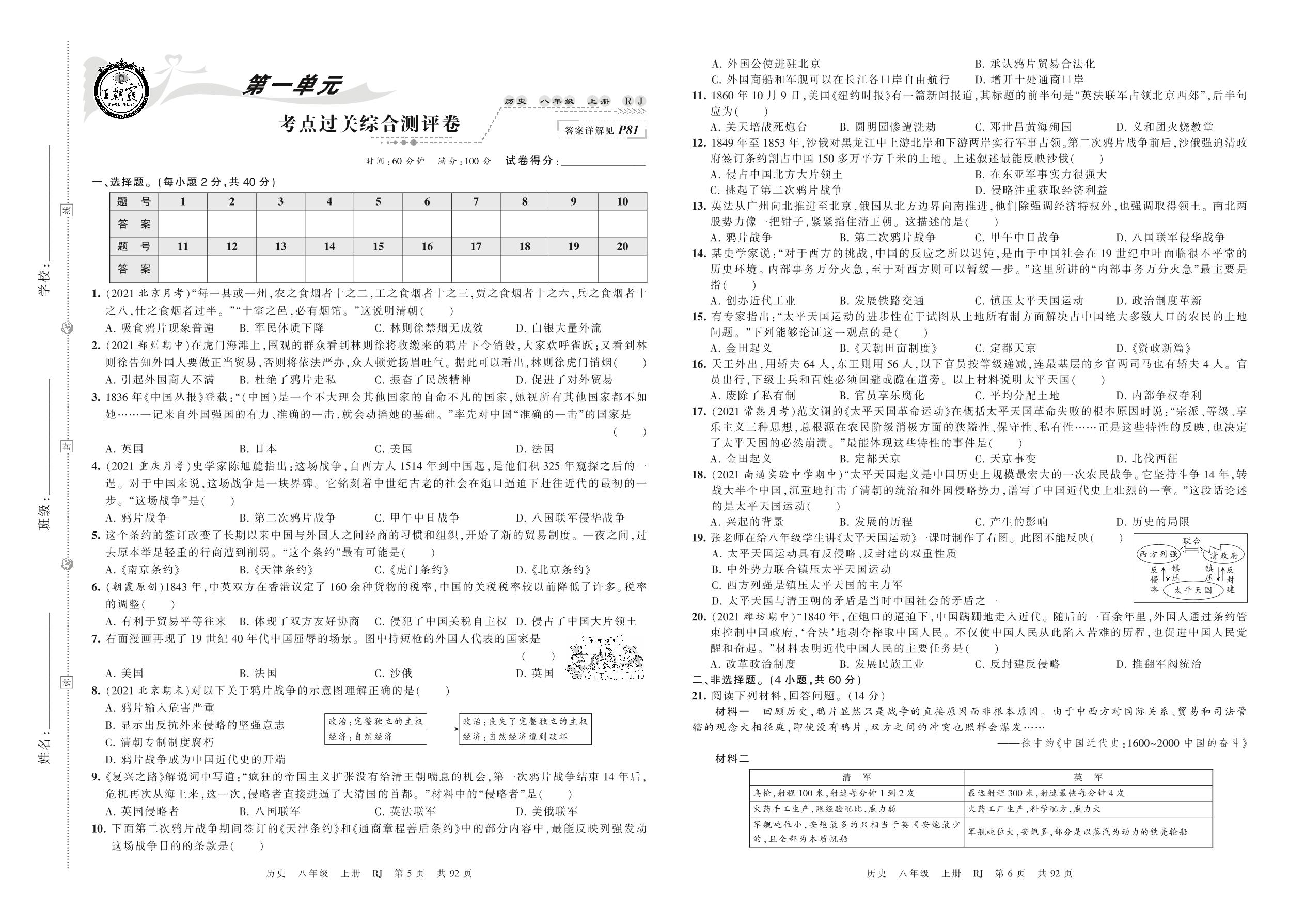 2021上册八年级历史人教版 第一单元 考点过关综合测评卷