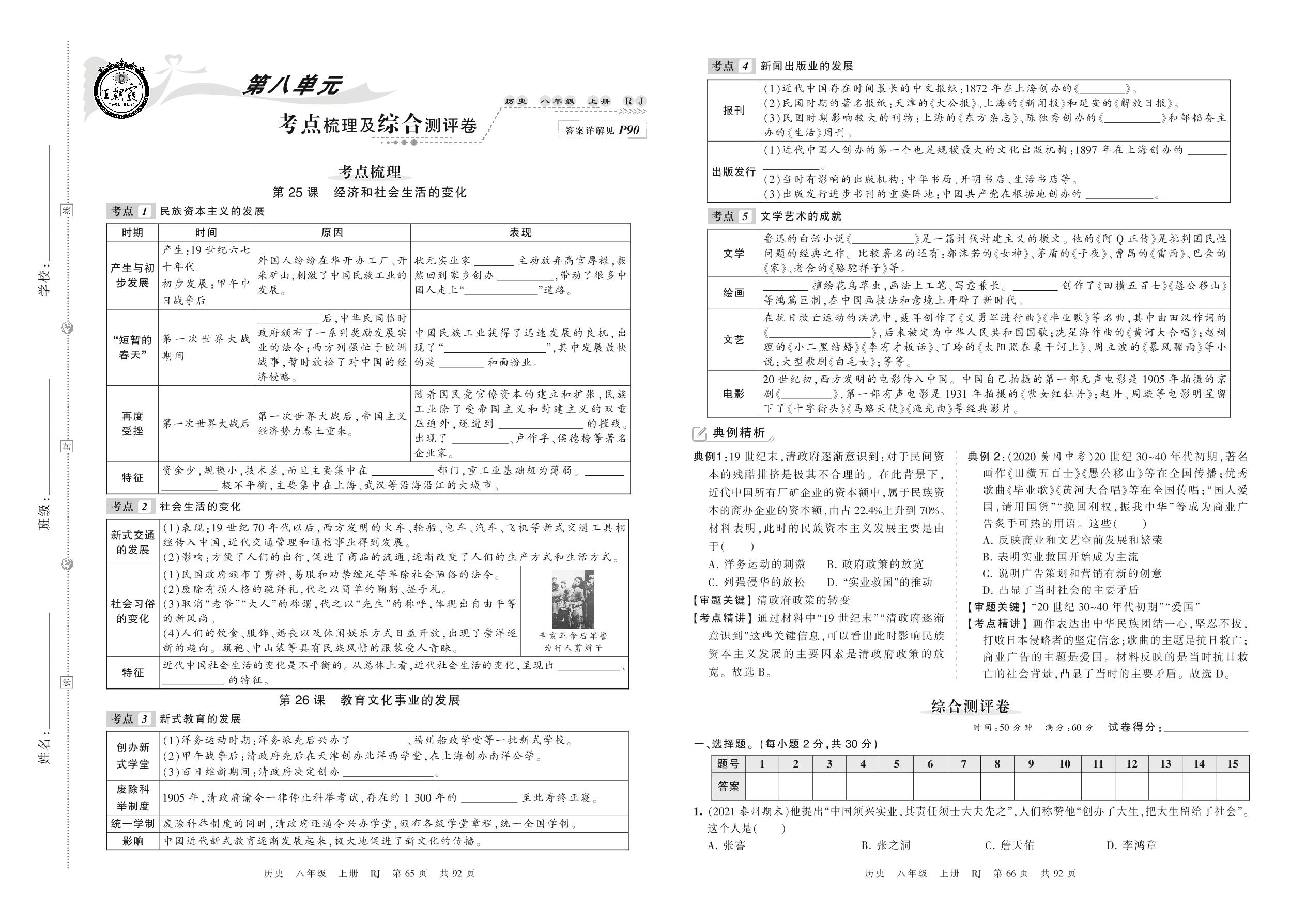 2021上册八年级历史人教版 第八单元 考点梳理及综合测评卷