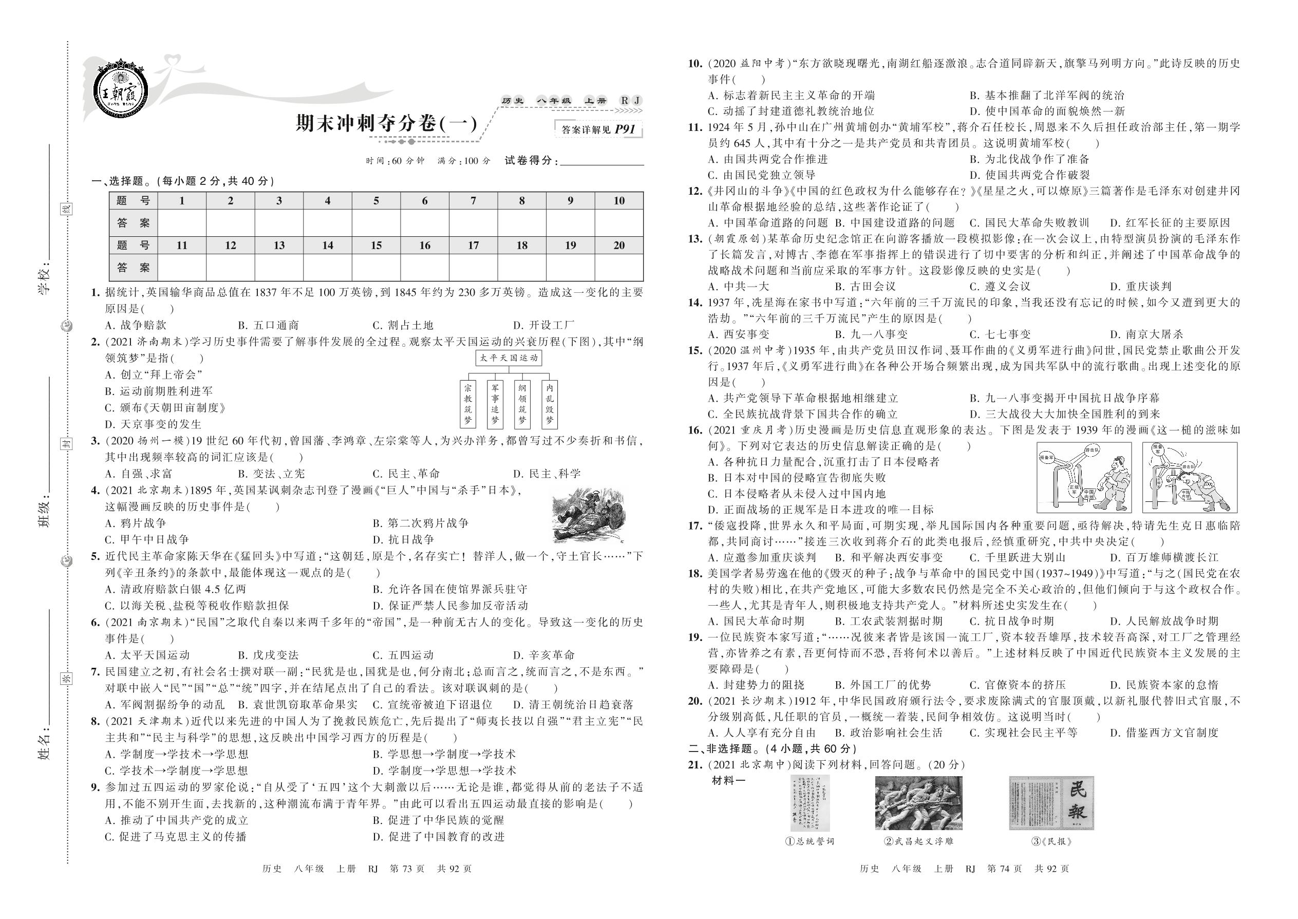 2021上册八年级历史人教版 期末冲刺夺分卷(一)