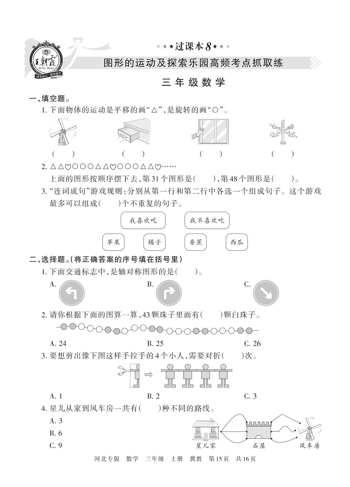 王朝霞期末过课本——图形的运动及探索乐园高频考点抓取练三年级上册数学(冀教版)【8】
