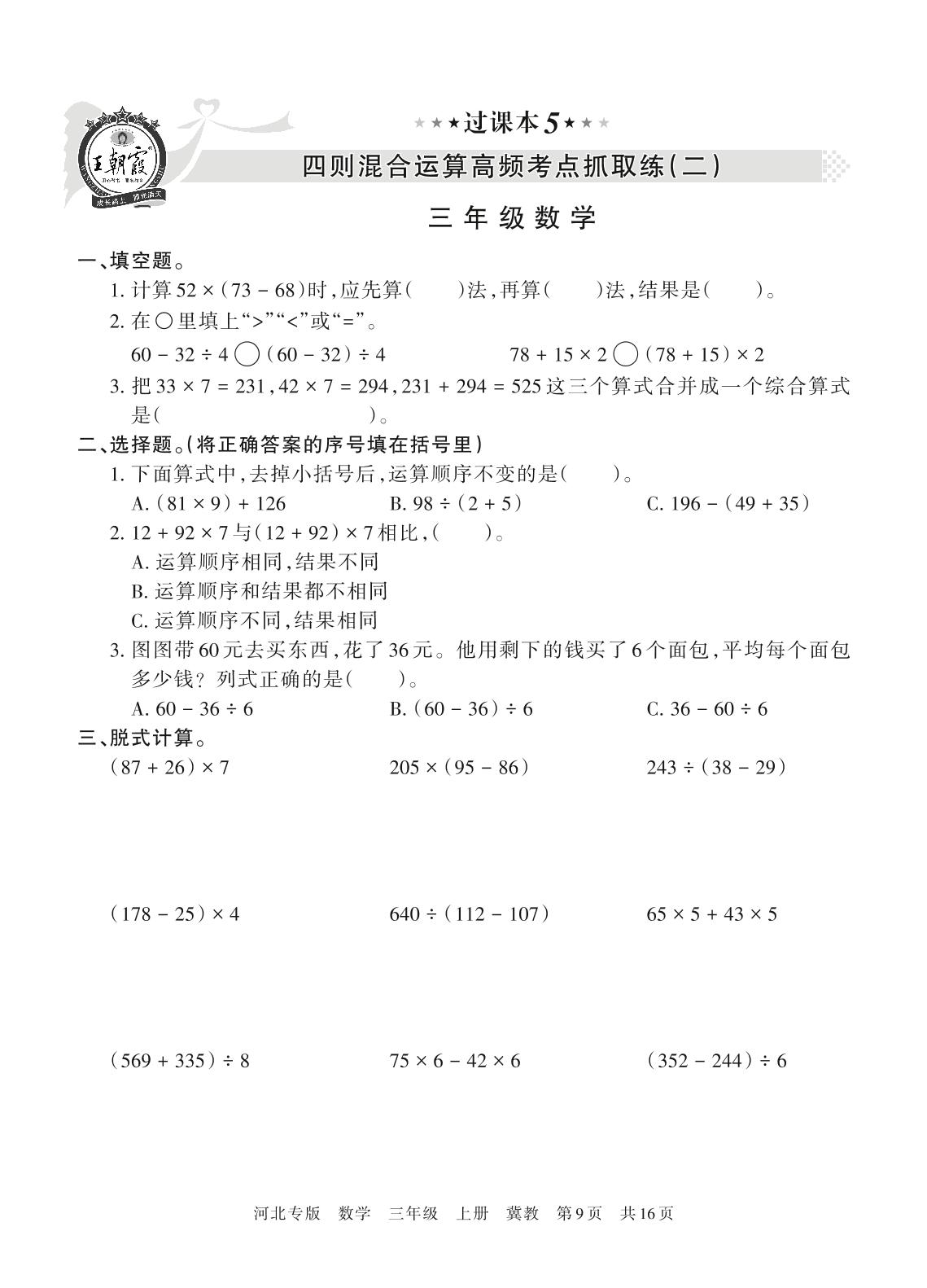 王朝霞期末过课本——四则混合运算高频考点抓取练(二)三年级上册数学(冀教版)【5】