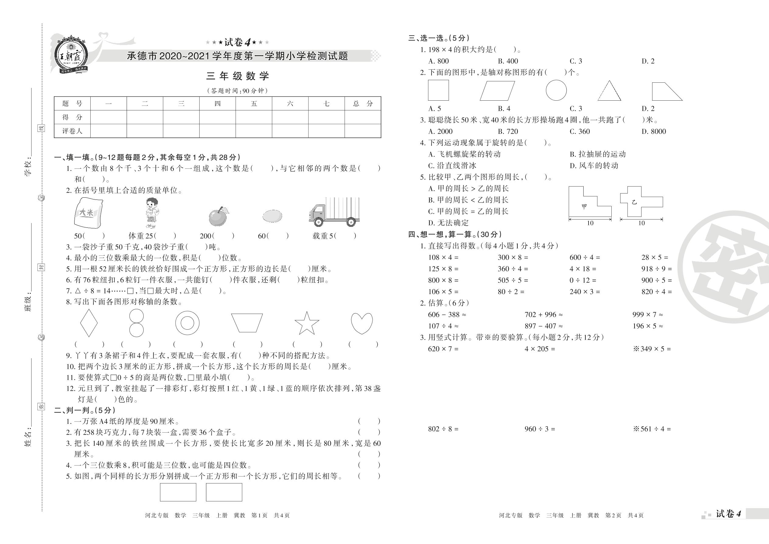承德市2020~2021学年度第一学期小学检测试题三年级数学(冀教版)【4】