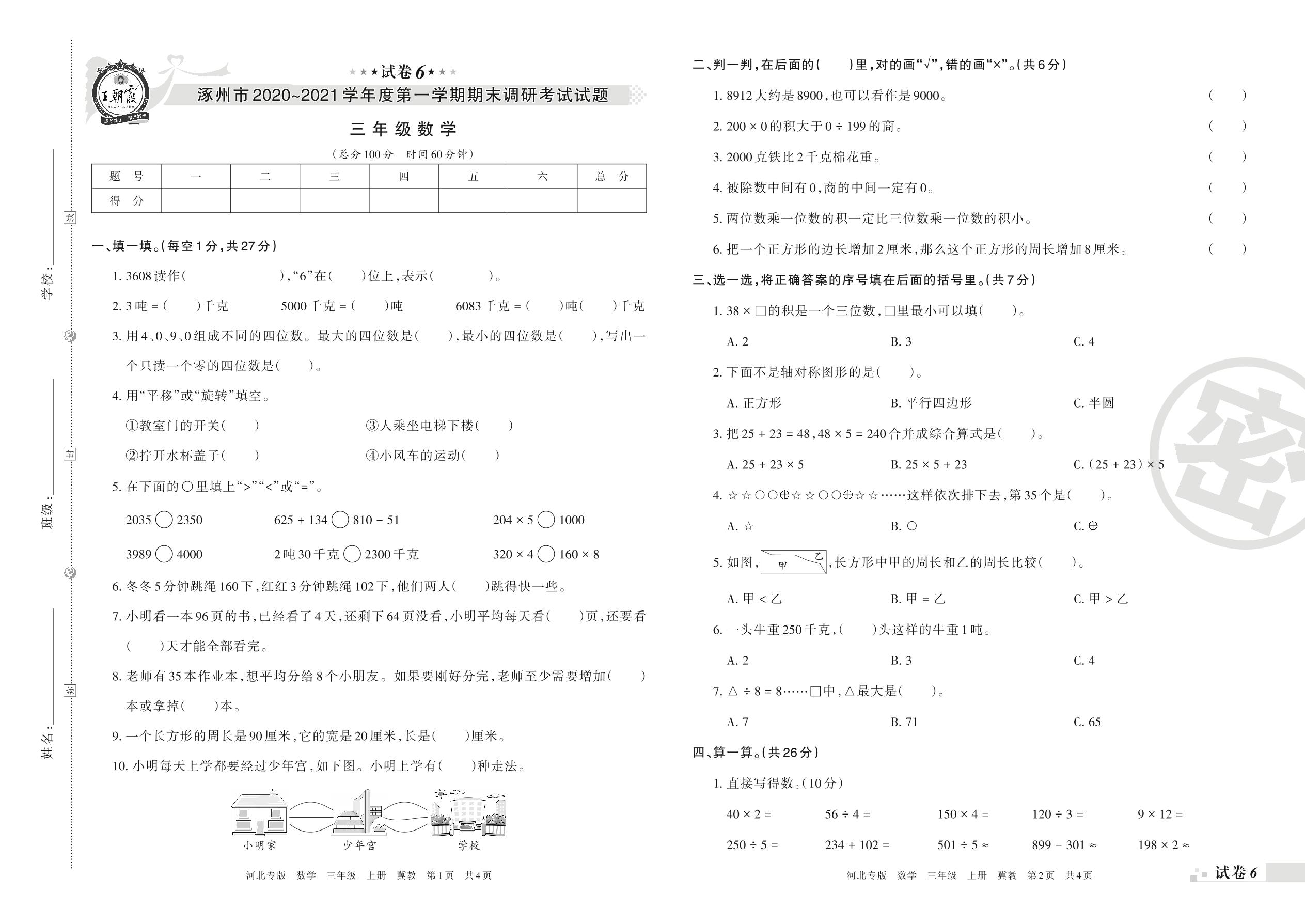 涿州市2020~2021学年度第一学期期末调研考试试题三年级数学(冀教版)【6】