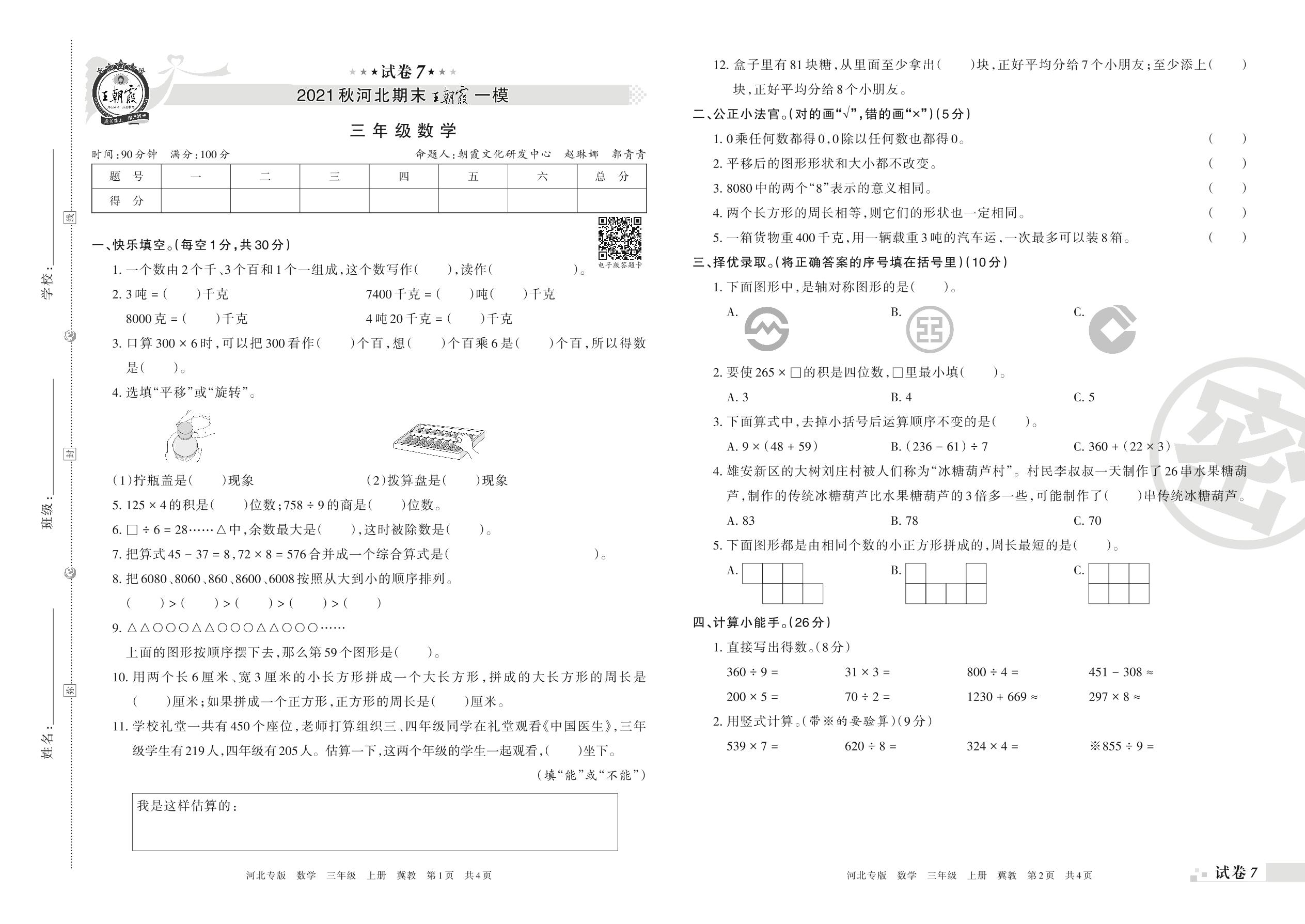 王朝霞期末模拟卷三年级上册数学(冀教版)【7】