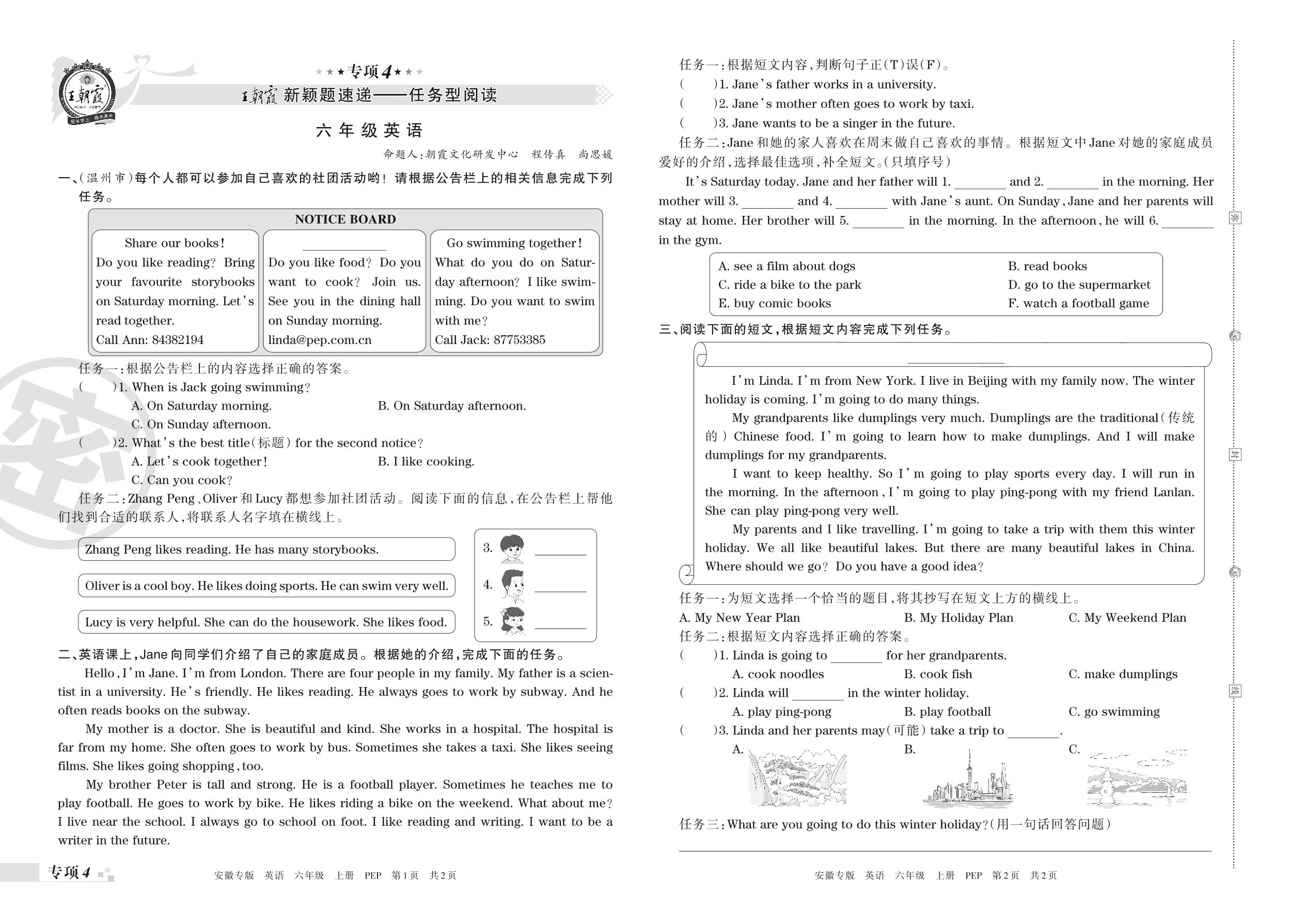 王朝霞期末专项卷——新颖题速递:任务型阅读六年级上册英语(人教PEP版)【4】