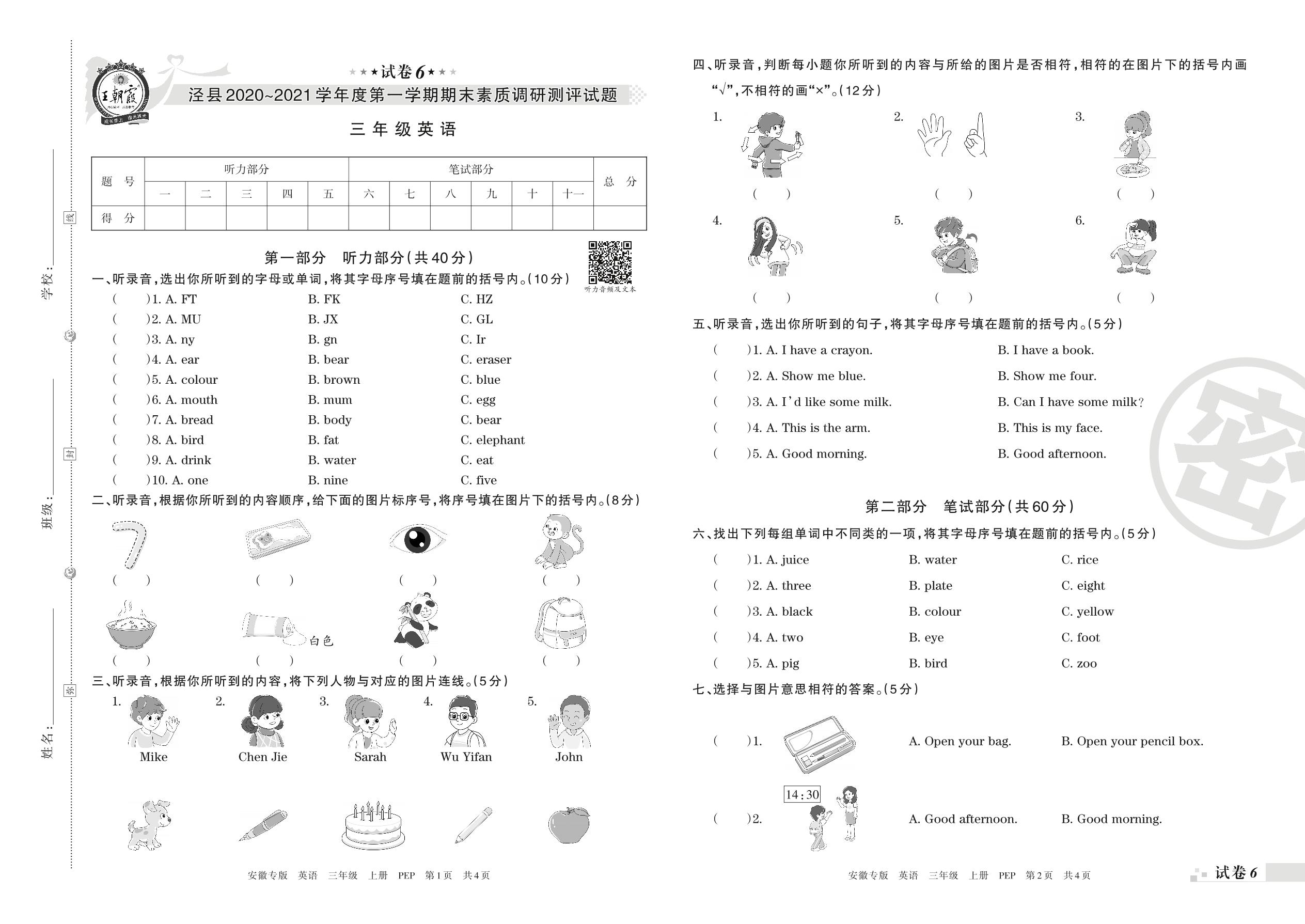 泾县2020~2021学年度第一学期期末素质调研测评试题三年级英语(人教PEP版)【6】