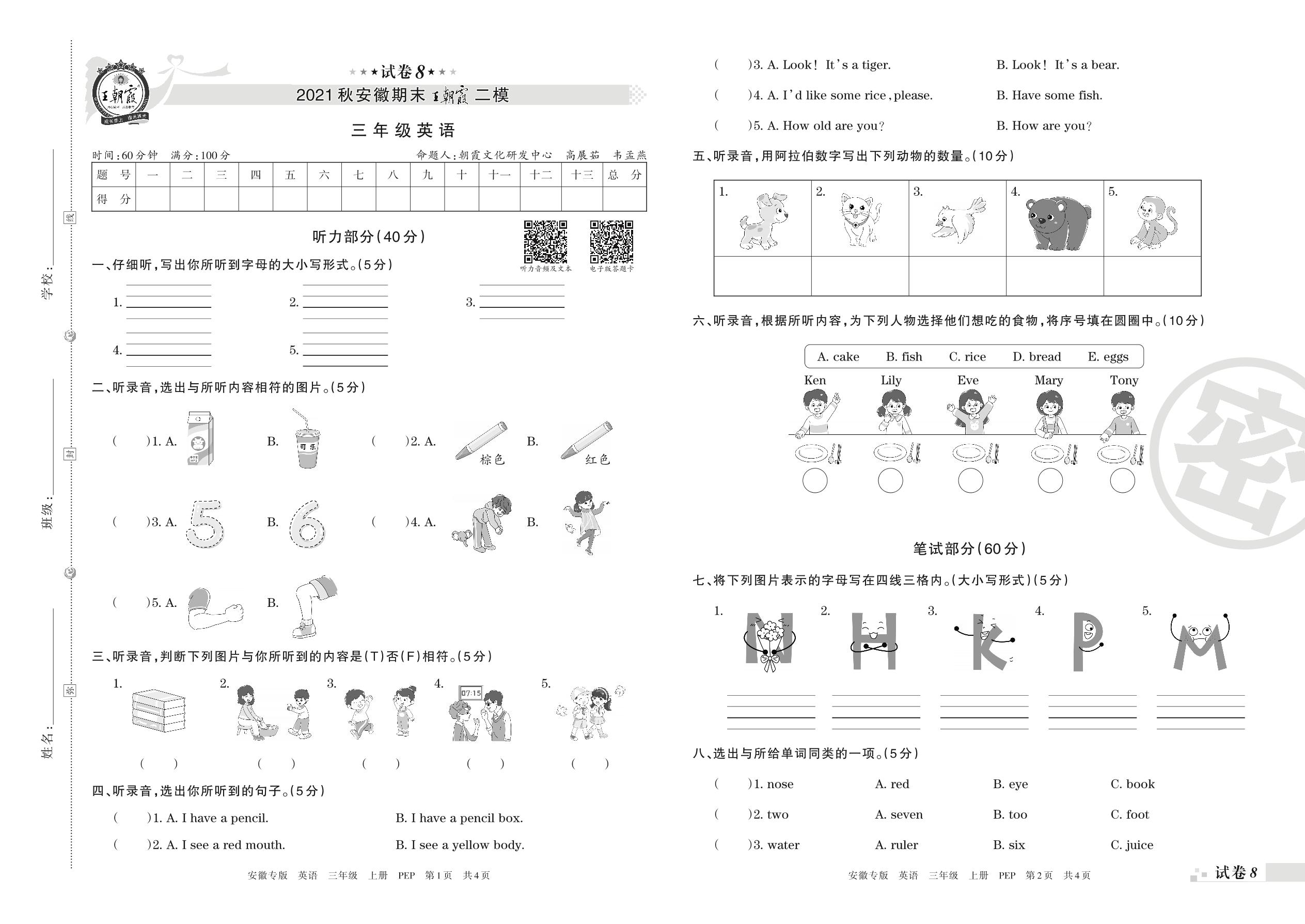 王朝霞期末模拟卷三年级上册英语(人教PEP版)【8】
