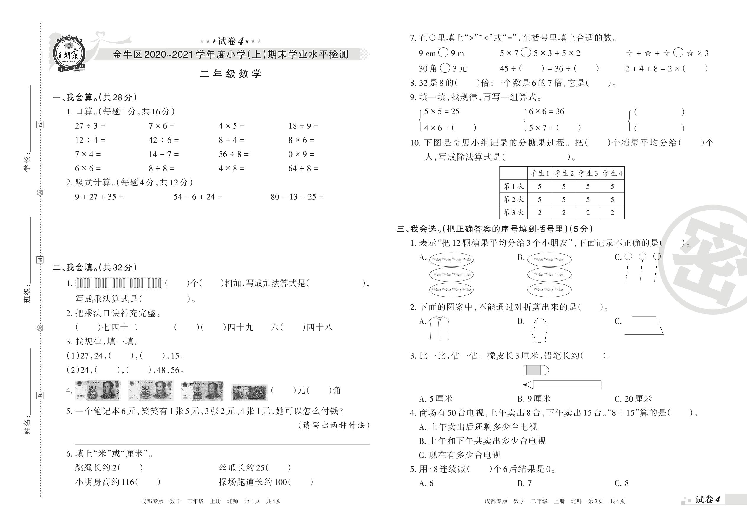 金牛区2020~2021学年度小学(上)期末学业水平检测二年级数学(北师版)【4】