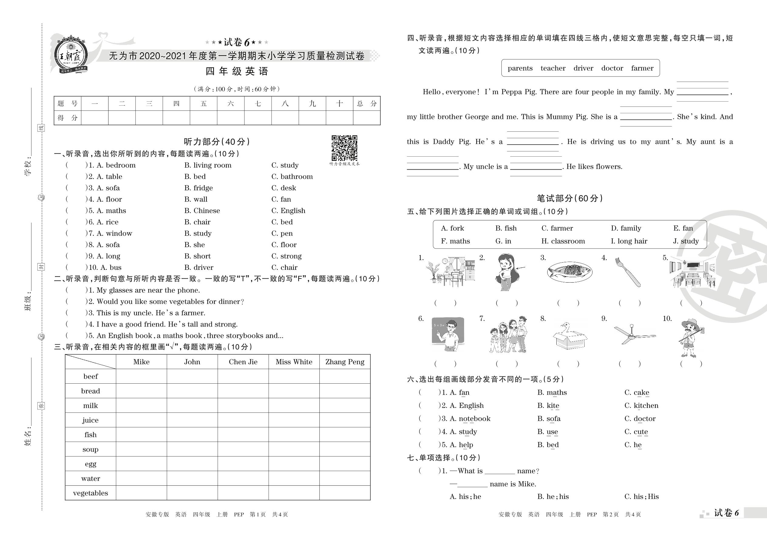 无为市2020~2021年度第一学期期末小学学习质量检测试卷四年级英语(人教PEP版)【6】