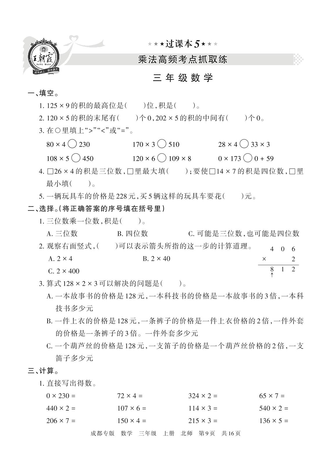 王朝霞期末过课本——乘法高频考点抓取练三年级上册数学(北师版)【5】