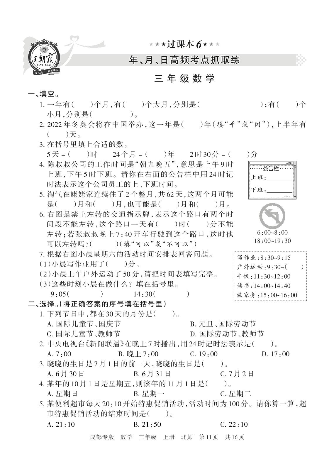 王朝霞期末过课本——年、月、日高频考点抓取练三年级上册数学(北师版)【6】