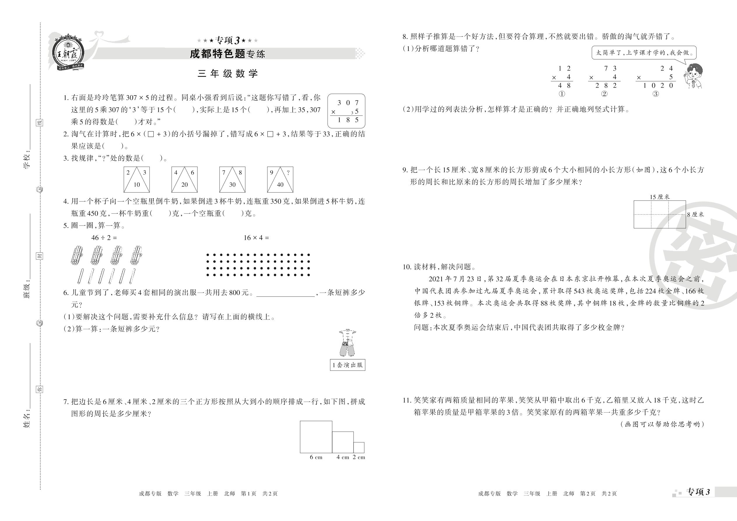 王朝霞期末专项卷——成都特色题专练三年级上册数学(北师版)【3】