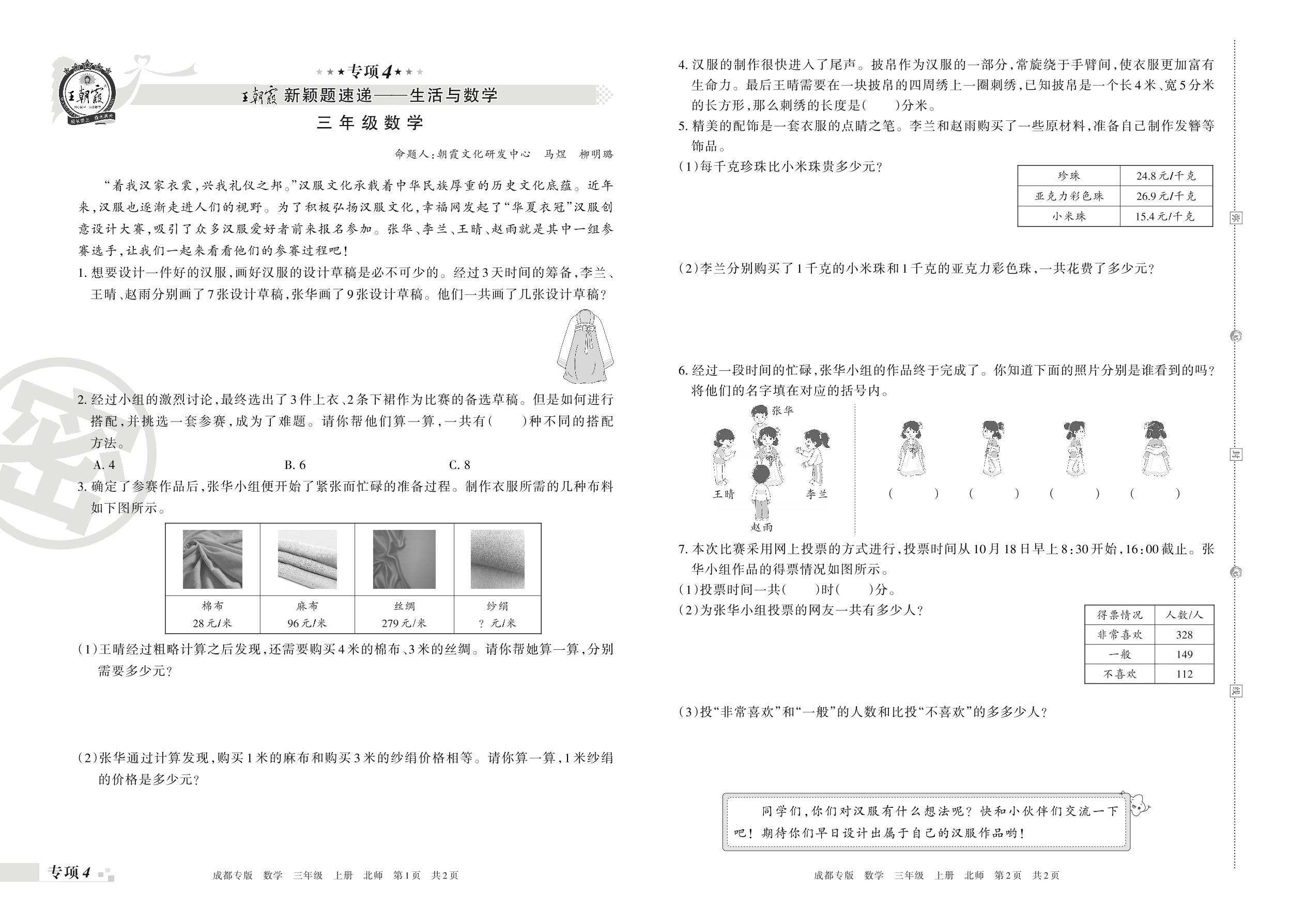 王朝霞期末专项卷——新颖题速递:生活与数学三年级上册数学(北师版)【4】