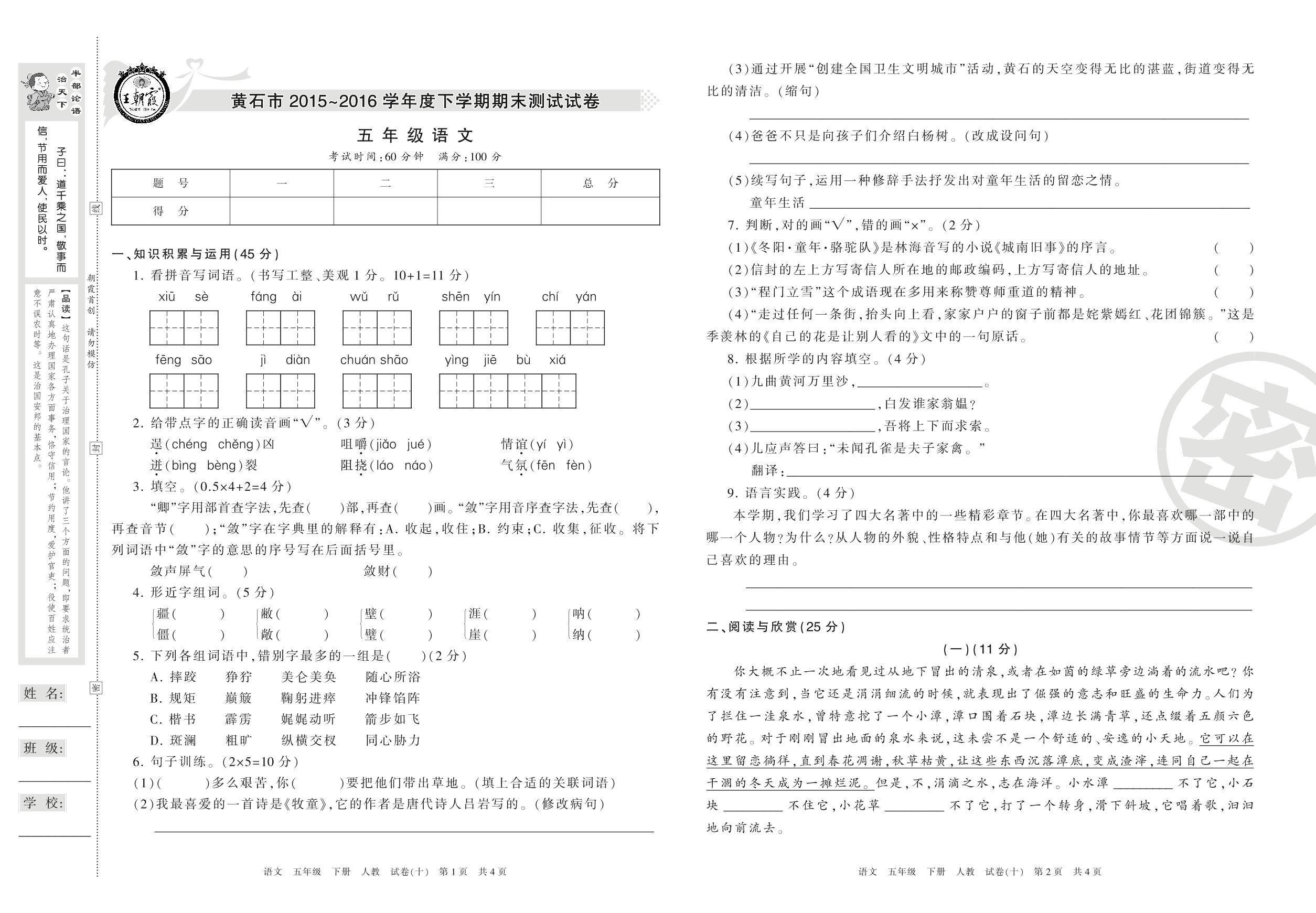 2015-2016学年第二学期黄石市五年级语文试卷(人教版)【10】
