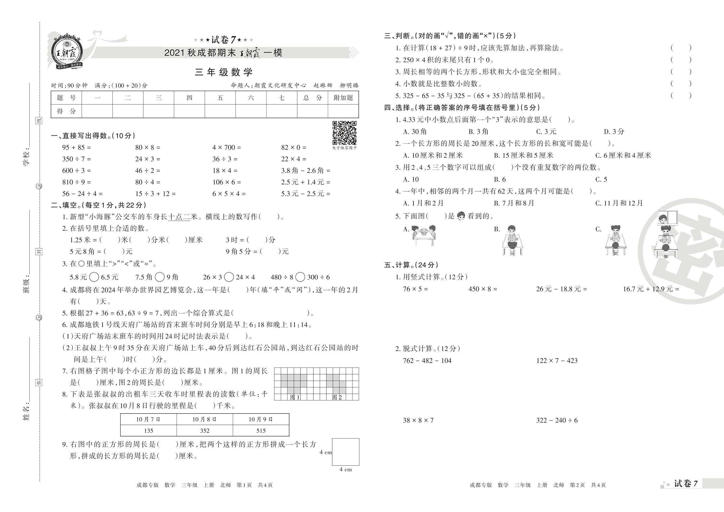 王朝霞期末模拟卷三年级上册数学(北师版)【7】
