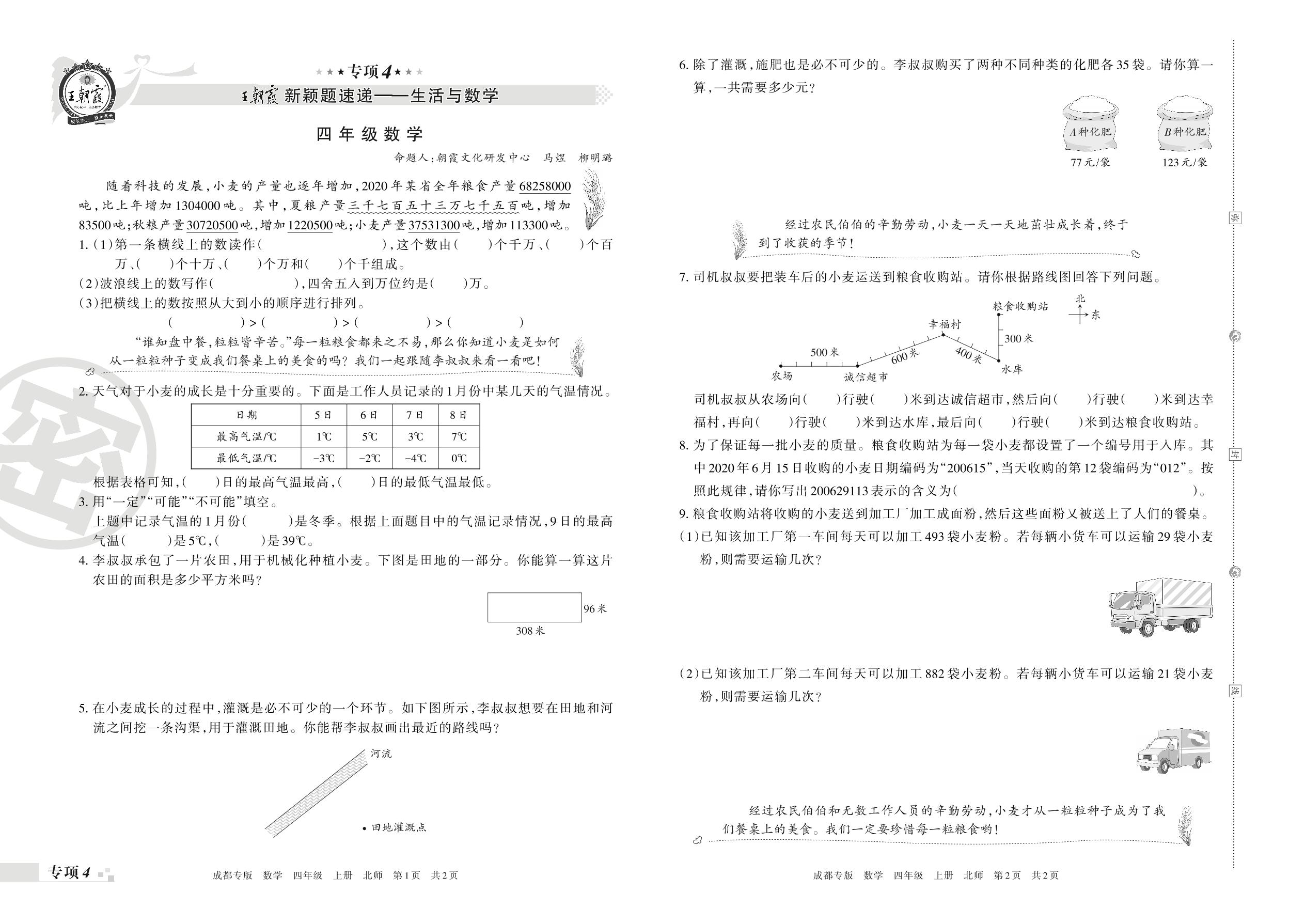 王朝霞期末专项卷——新颖题速递:生活与数学四年级上册数学(北师版)【4】