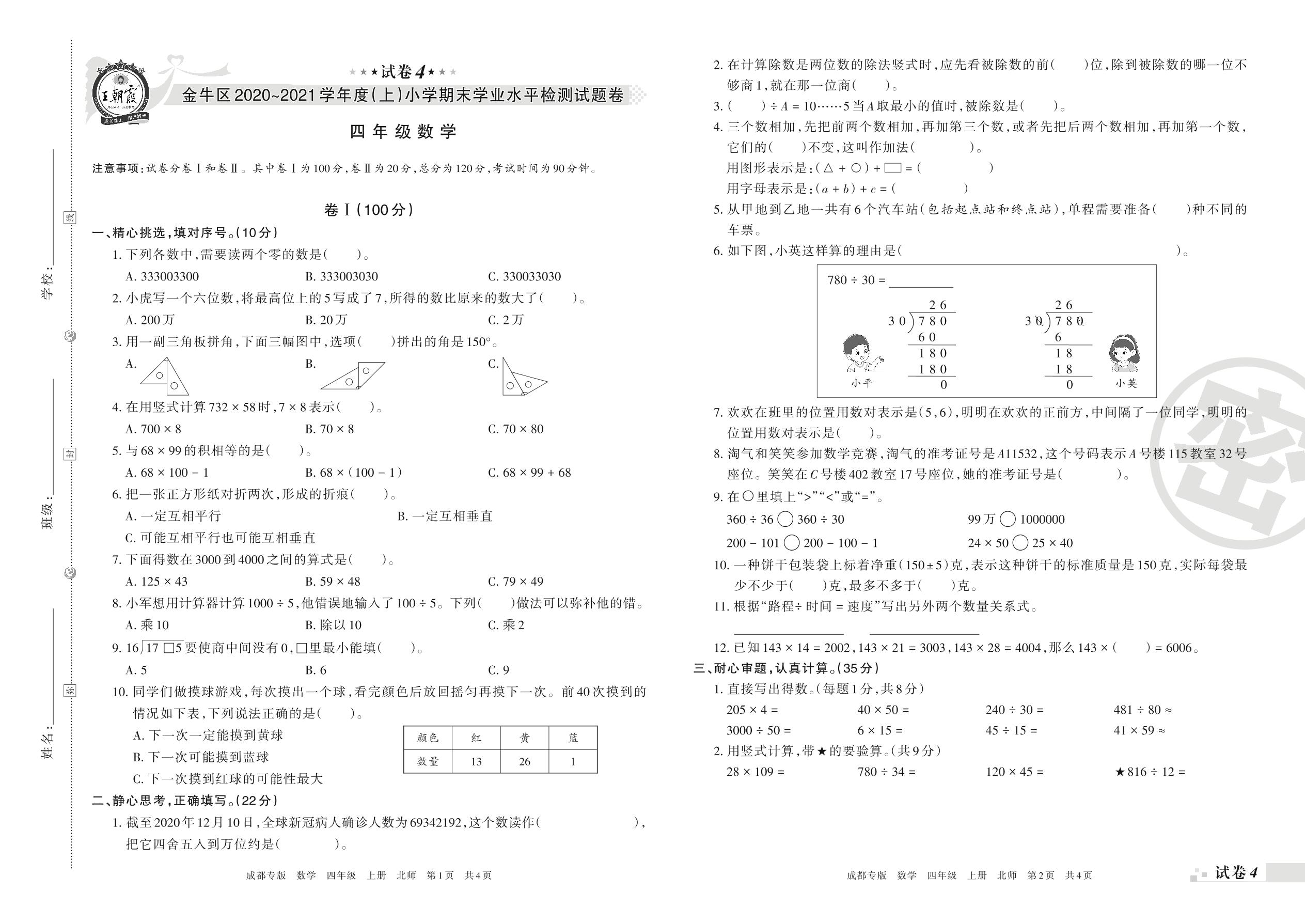 金牛区2020~2021学年度(上)小学期末学业水平检测试题卷四年级数学(北师版)【4】
