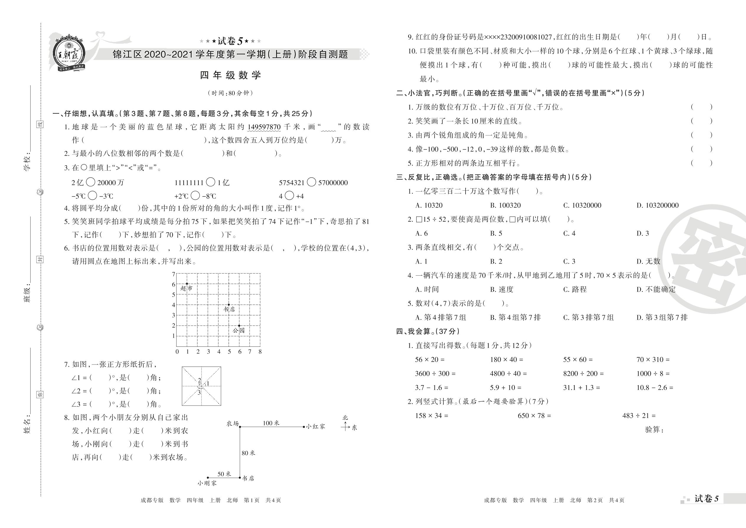 锦江区2020~2021学年度第一学期(上册)阶段自测题四年级数学(北师版)【5】