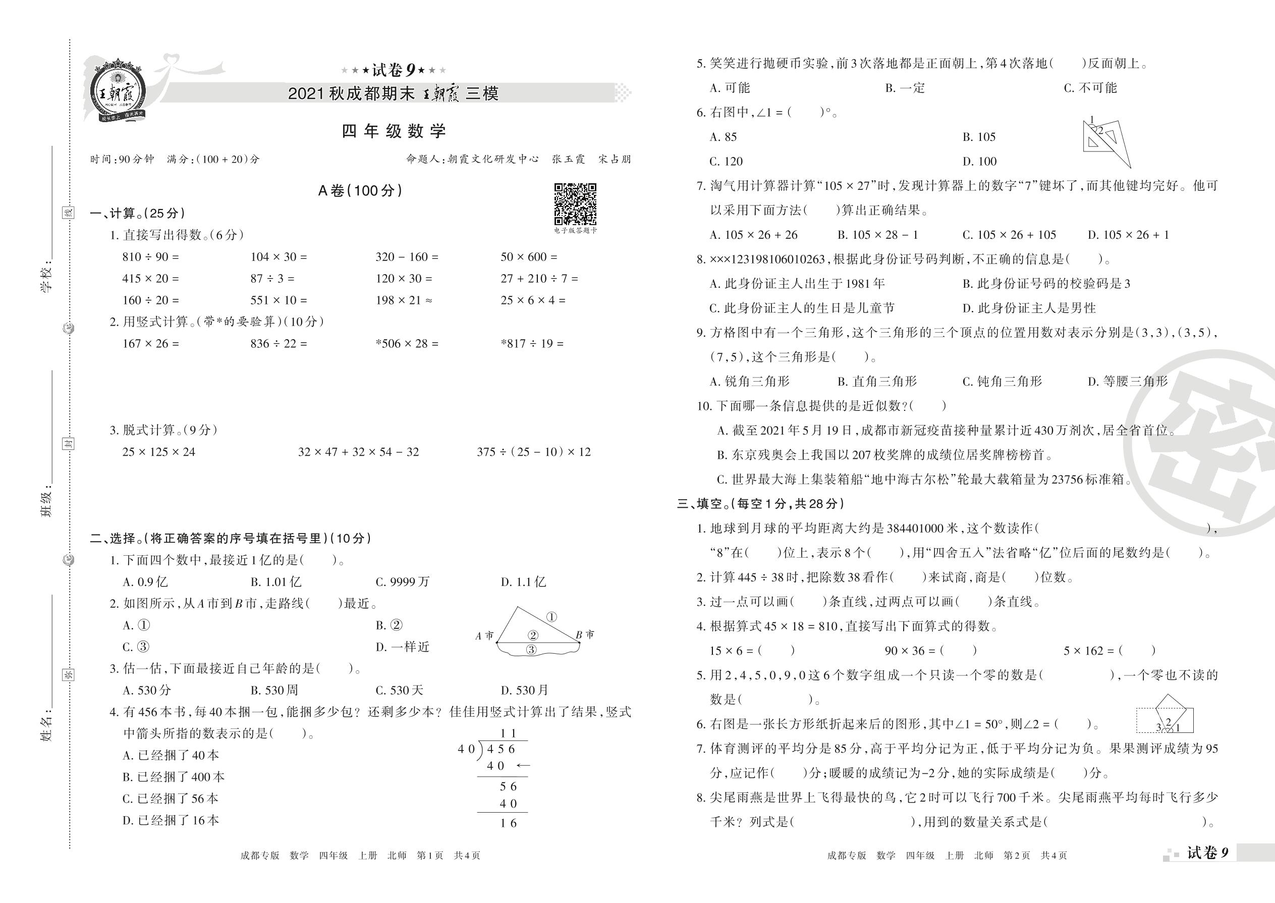 王朝霞期末模拟卷四年级上册数学(北师版)【9】